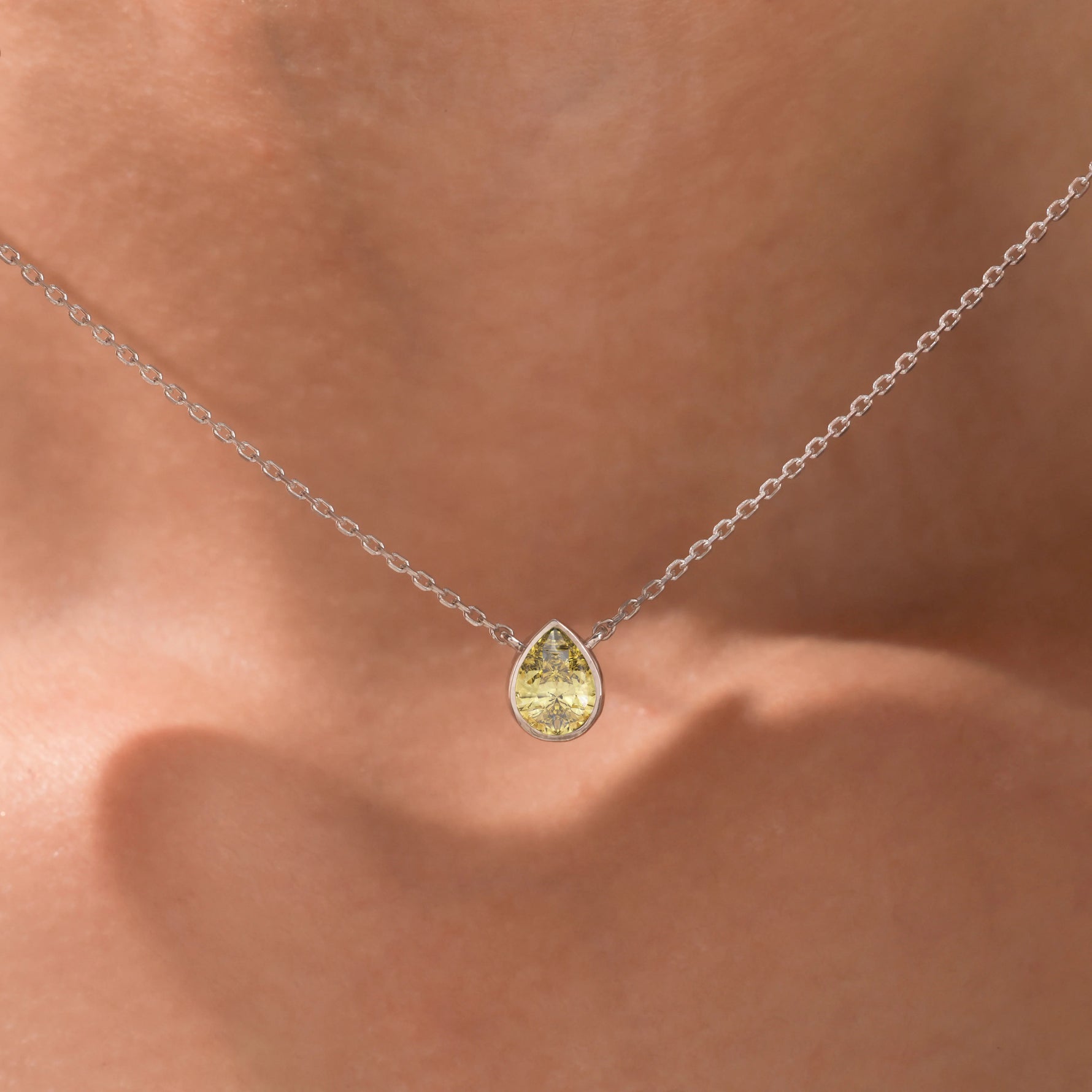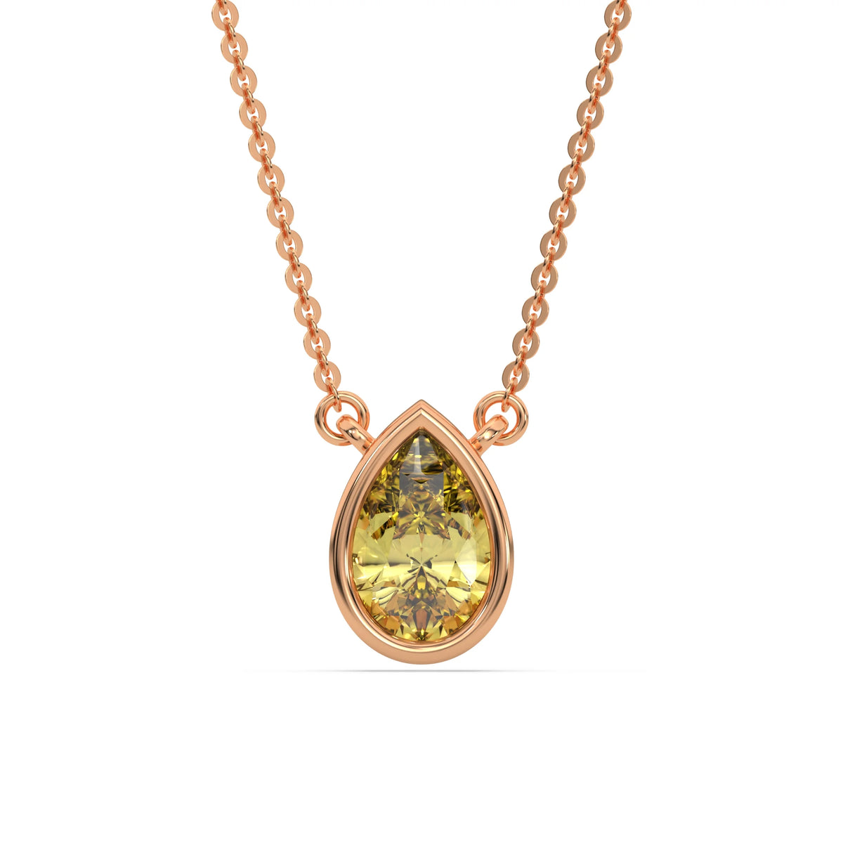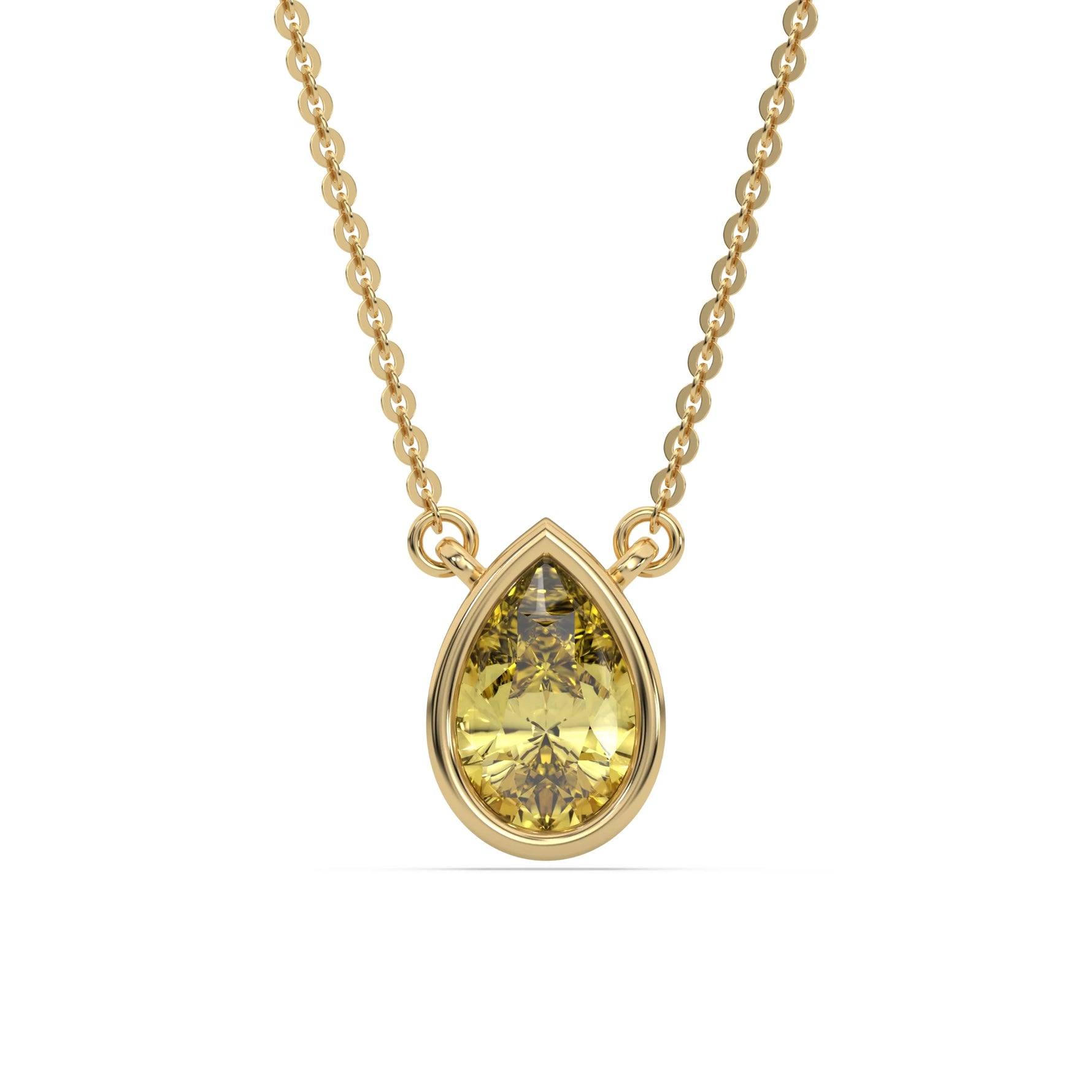 Fancy Yellow Pear Solitaire Diamond Necklace made with a fancy yellow pear cut diamond in bezel setting with adjustable chain.