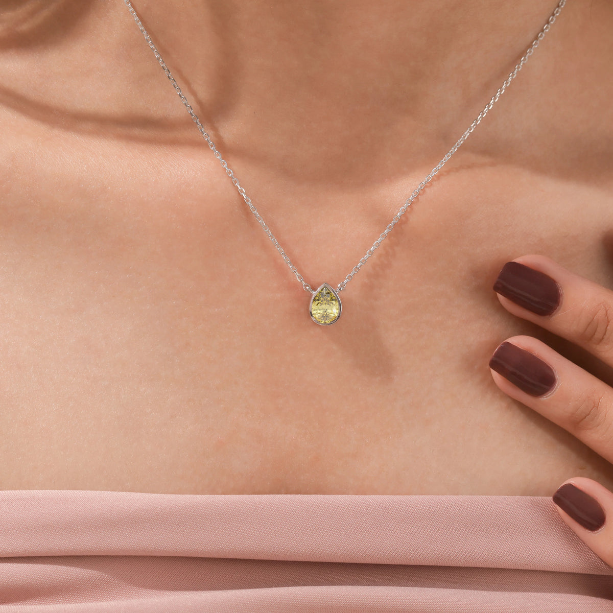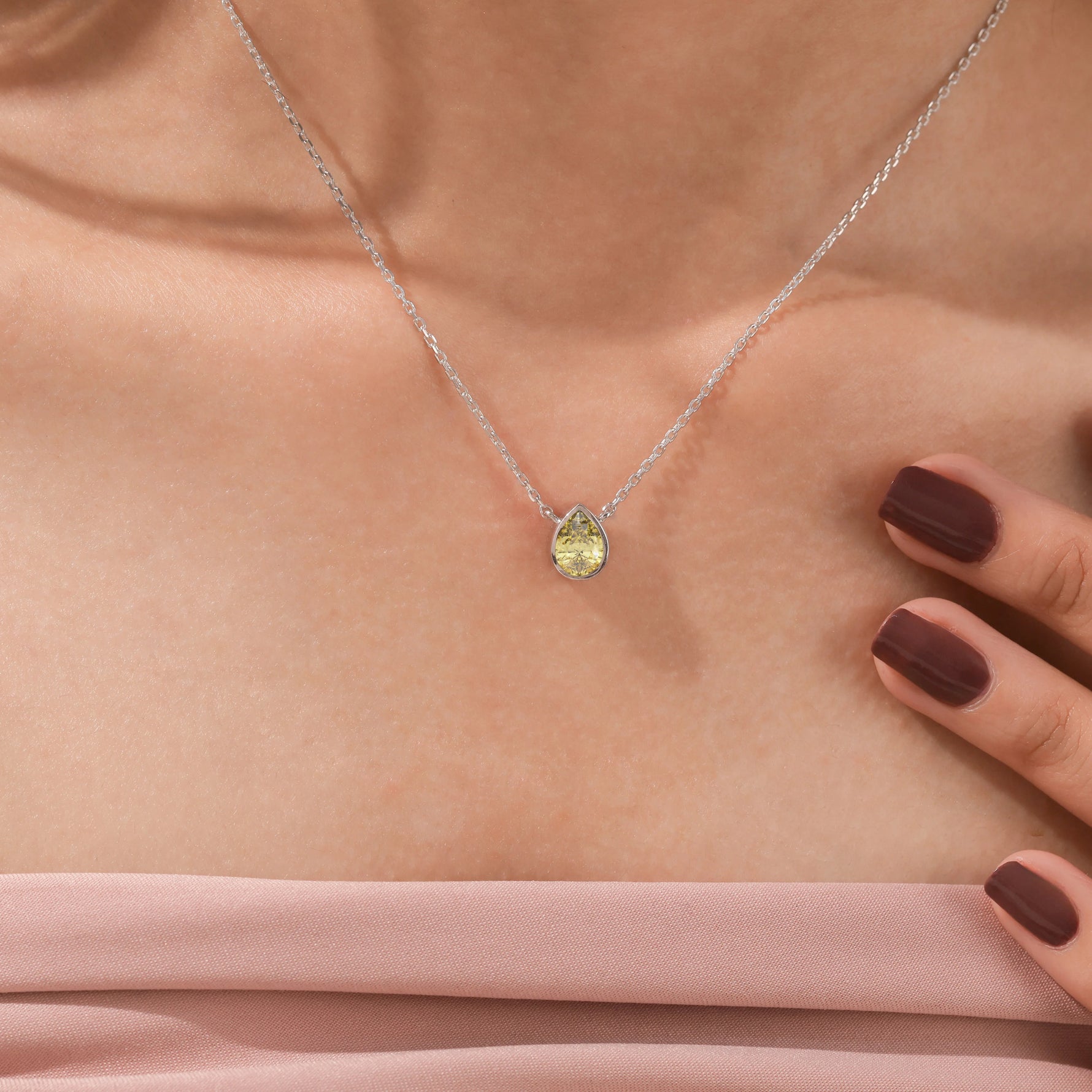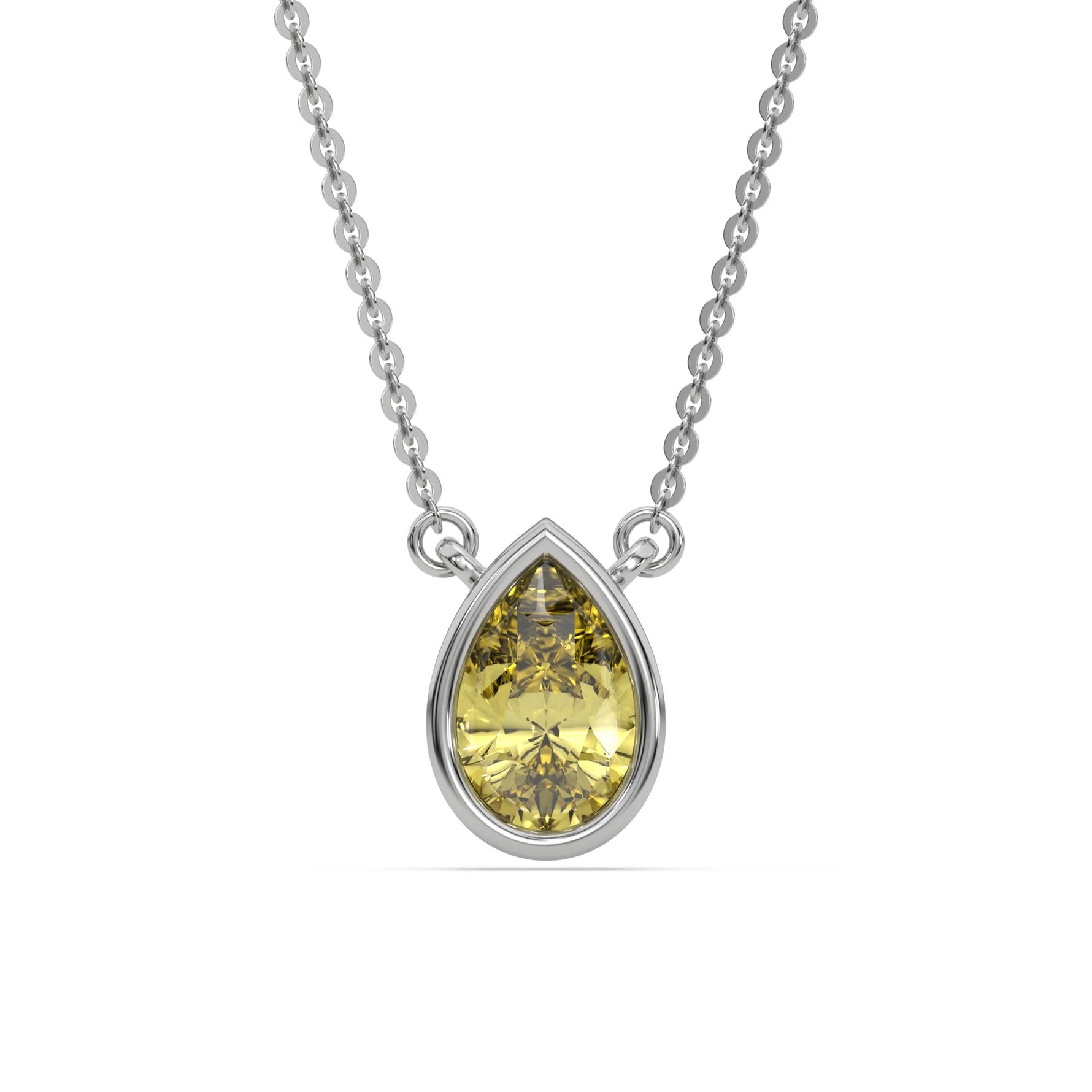 Fancy Yellow Pear Solitaire Diamond Necklace made with a fancy yellow pear cut diamond in bezel setting with adjustable chain.
