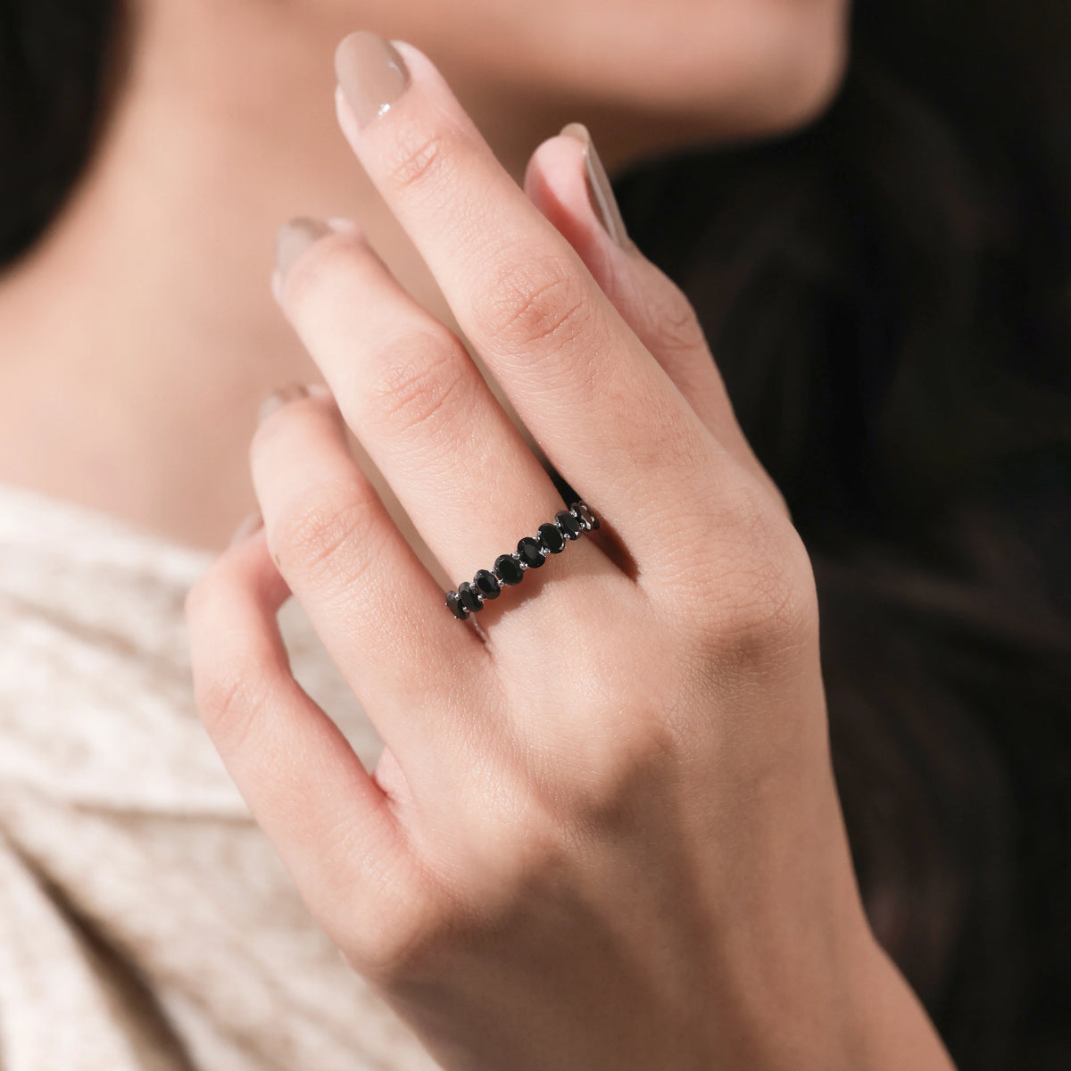 This 4 mm half eternity band features approximately 1.17 carats of oval Natural Black Diamonds set in shared prong setting.