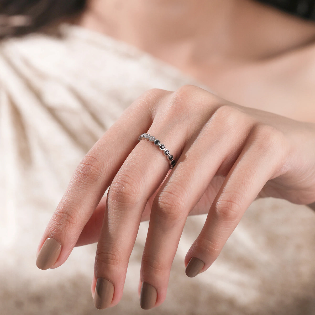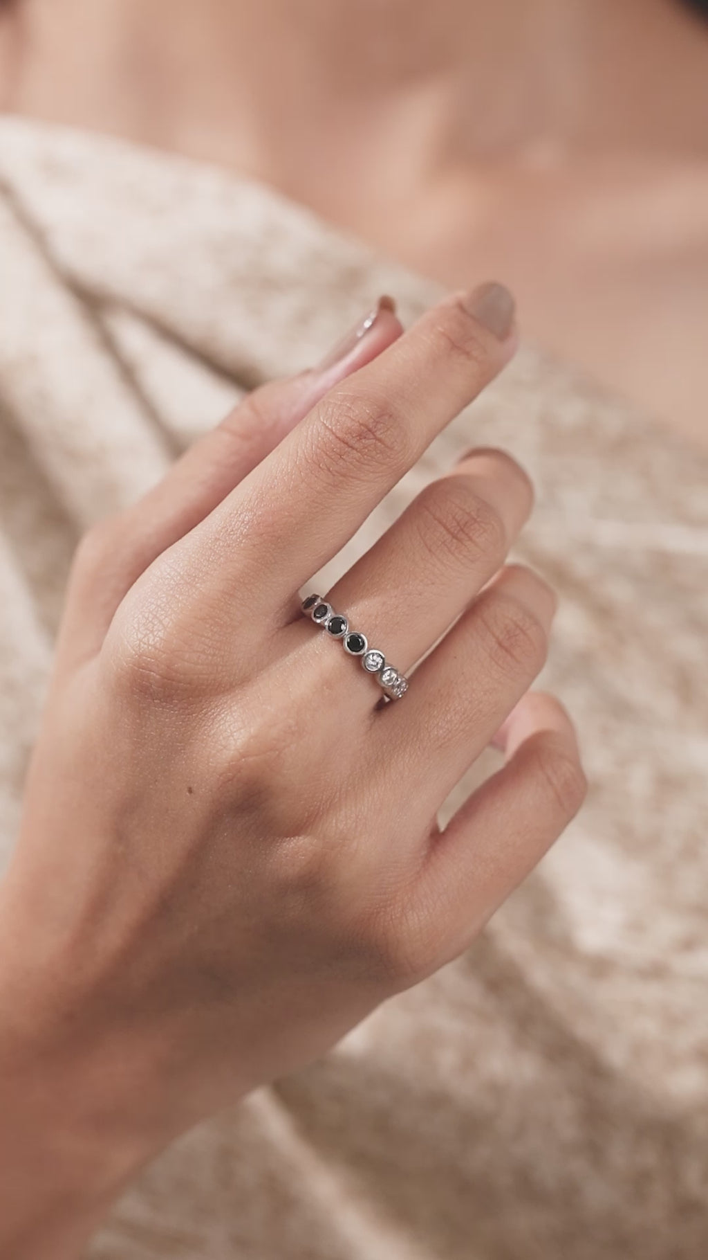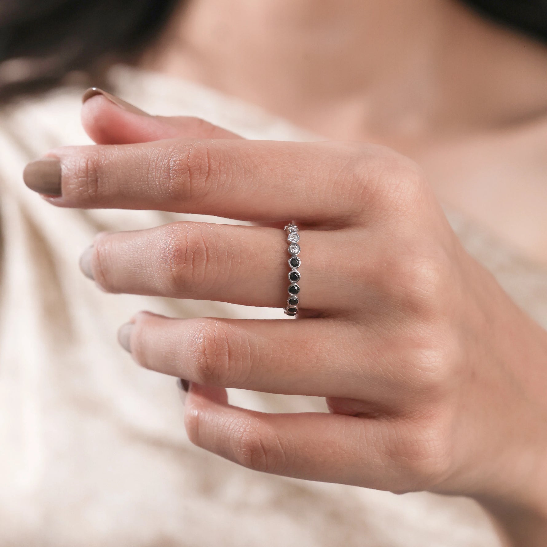 This 3 mm half black and half white full eternity band features approximately 0.35 carats of round lab grown diamonds and 0.35 carats of natural black diamonds, set in a bezel setting.