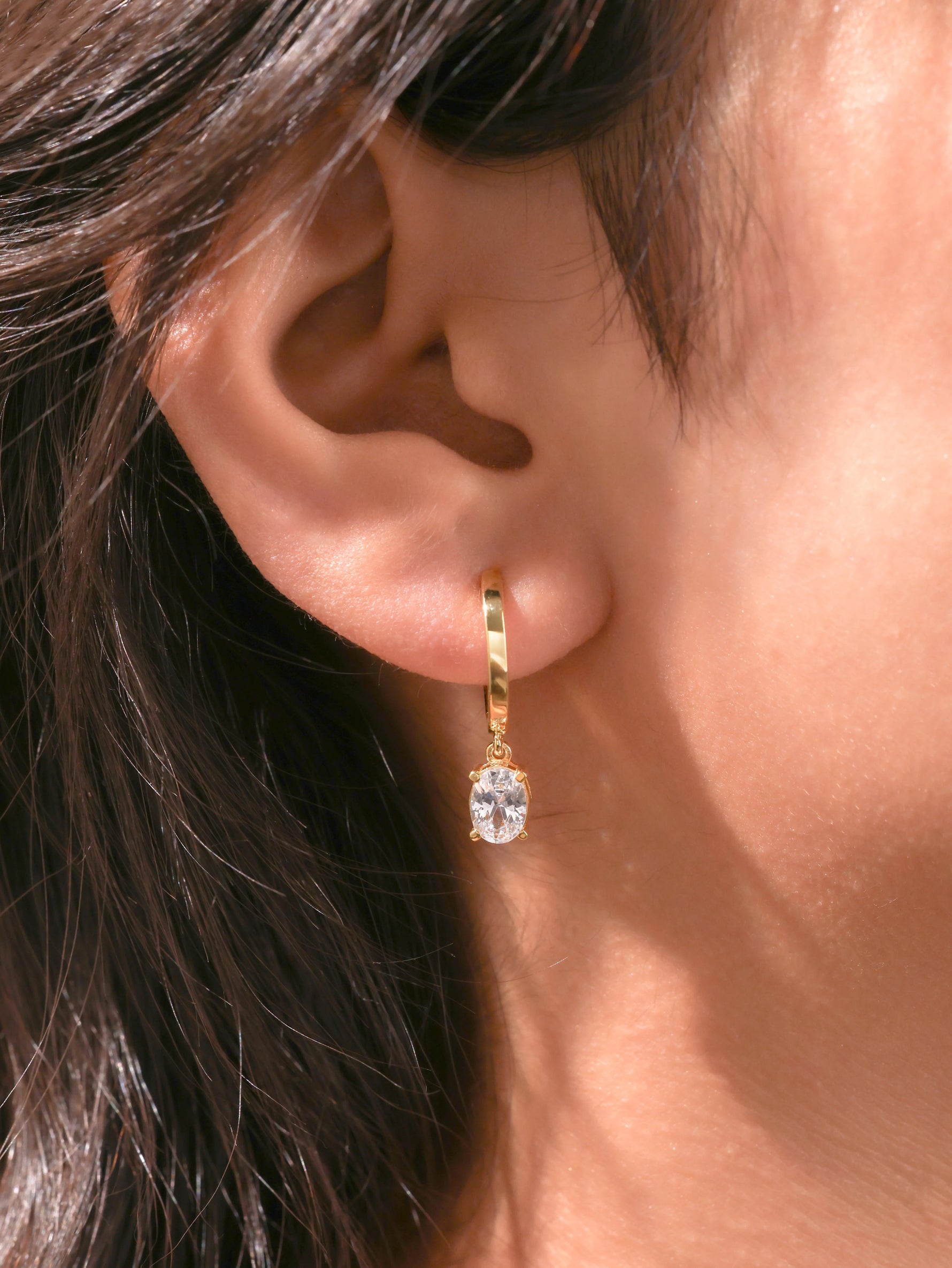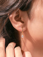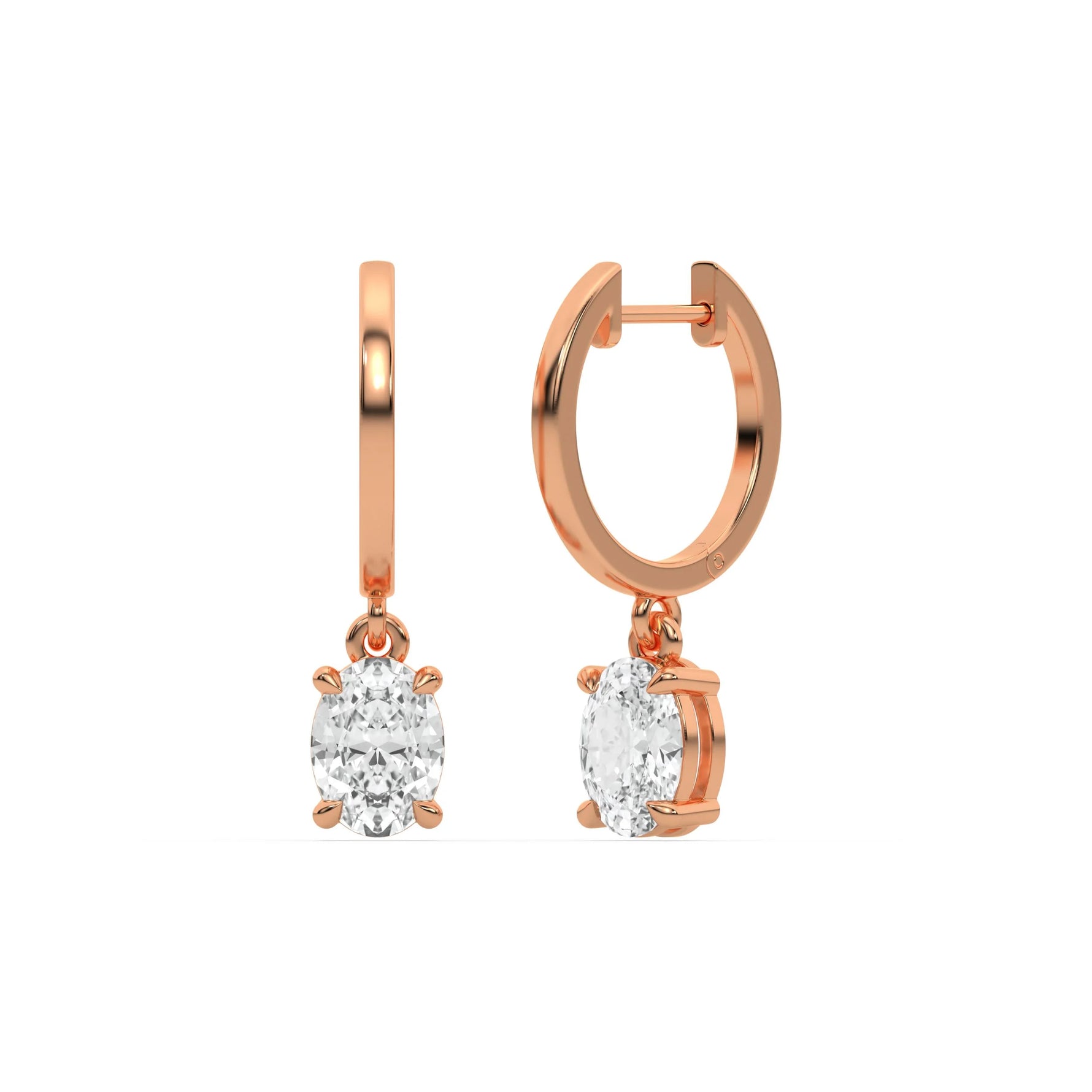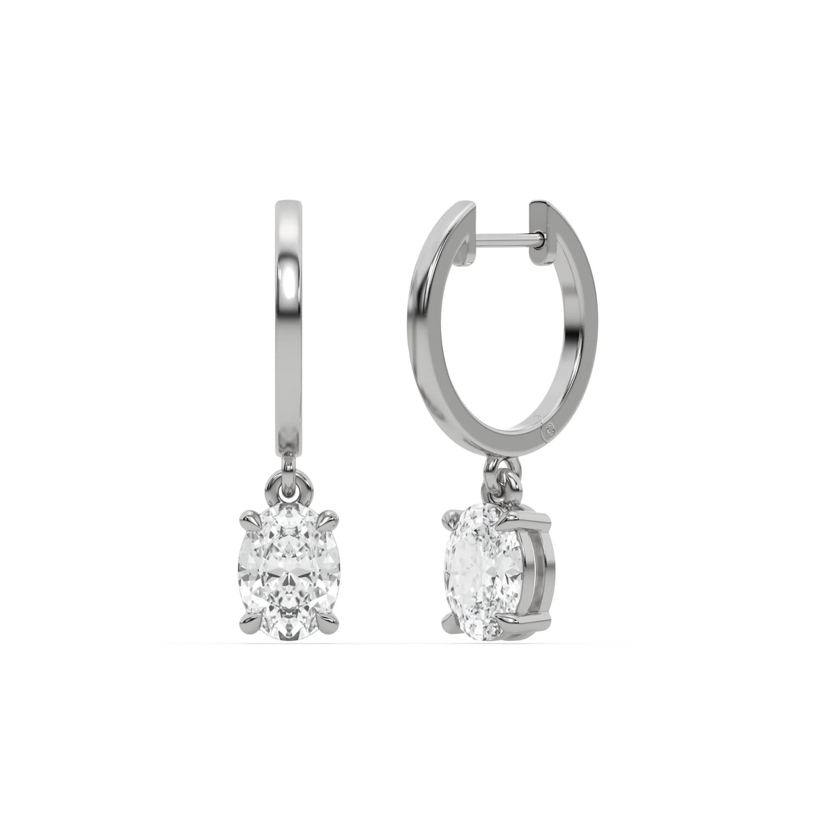 Gold hoop earrings features a dangling oval diamond on each hoop, securely set in a prong setting.