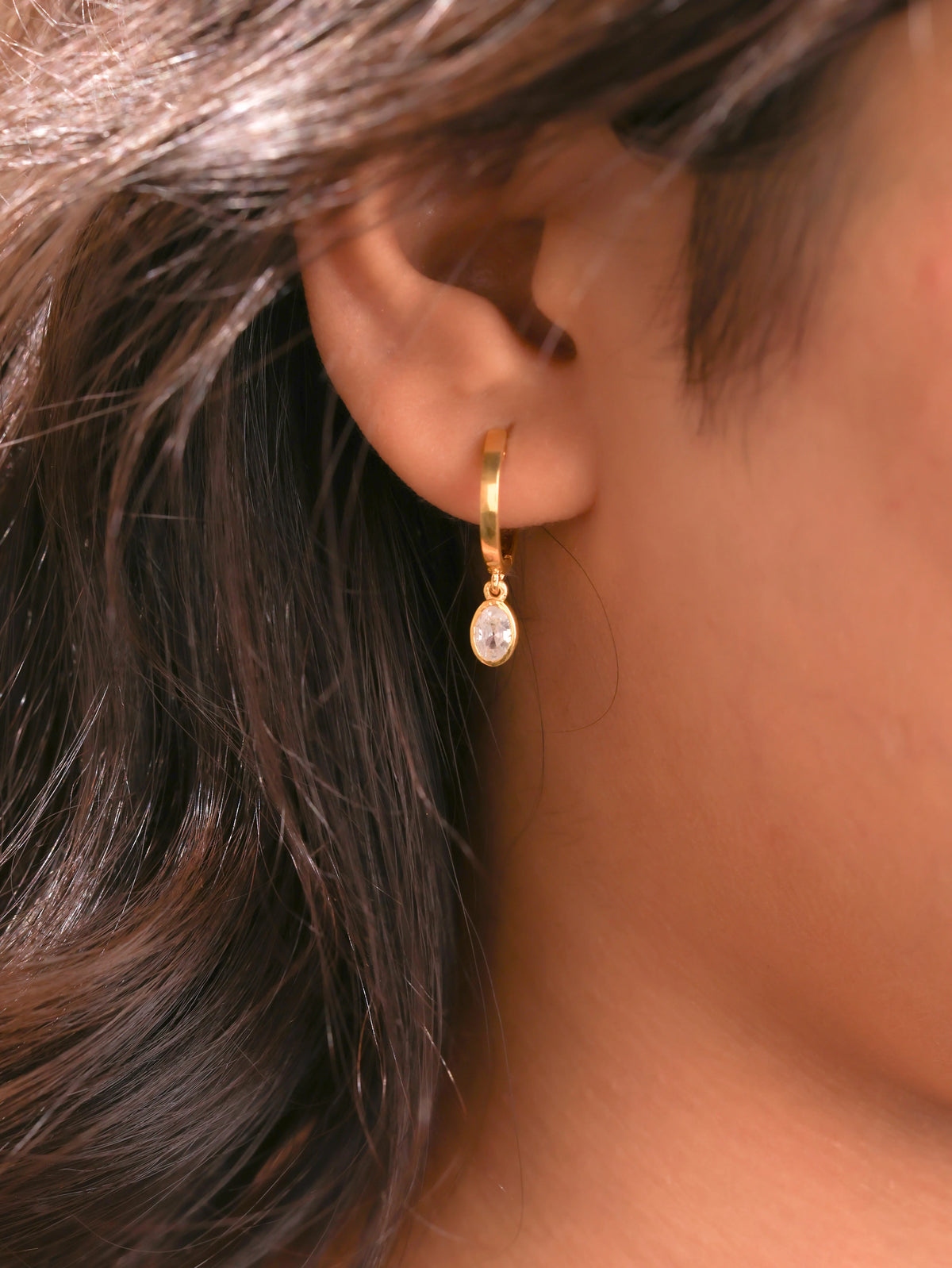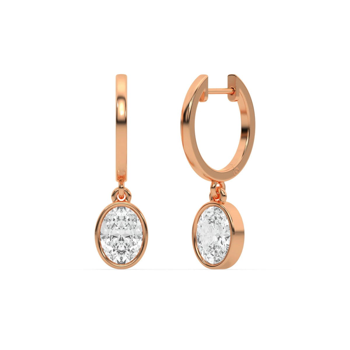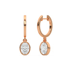 Gold hoops featuring a dangling oval diamond on each hoop, securely set in a bezel setting.