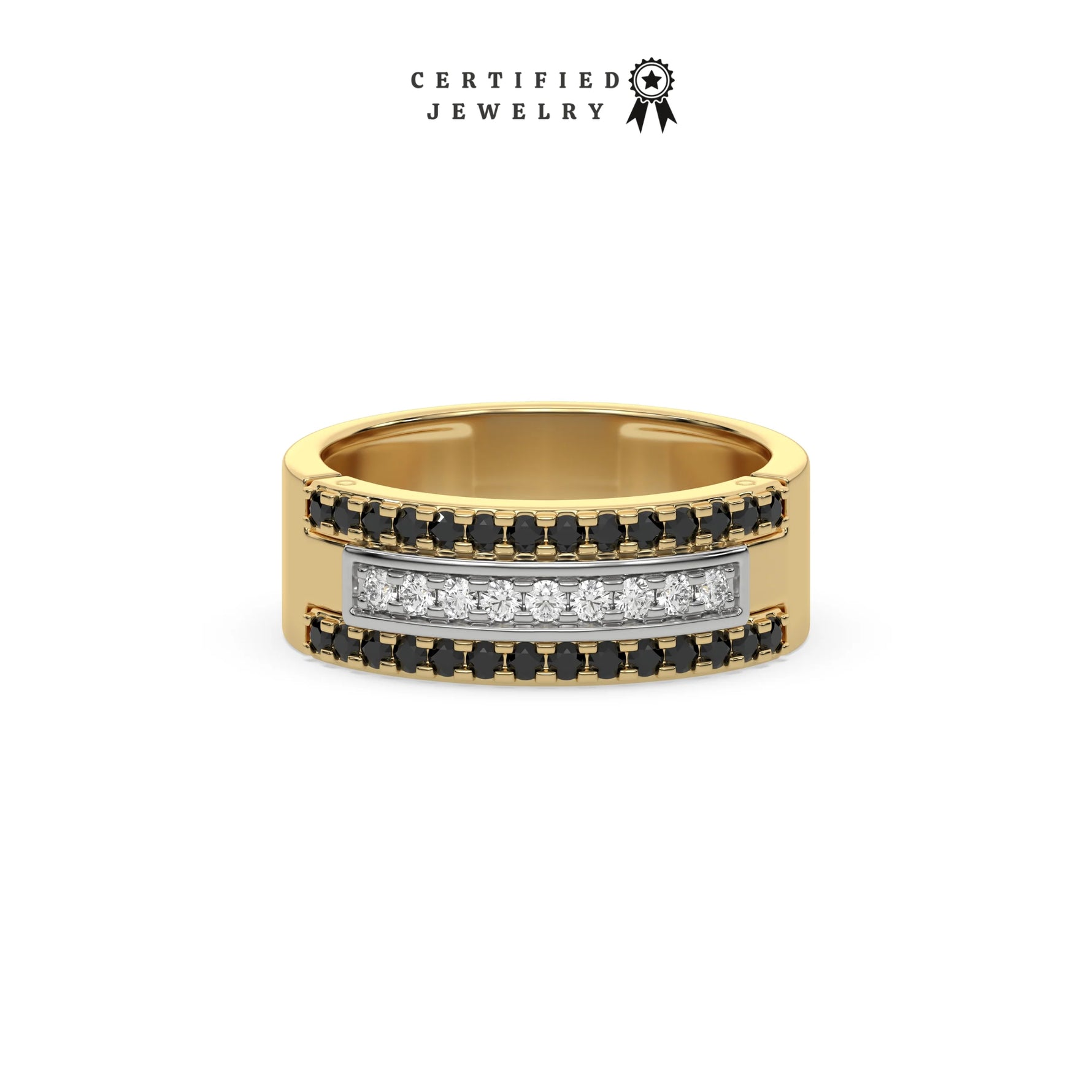 Men's Tres diamond ring, a stunning piece made with three rows of round brilliant-cut diamonds and round black diamonds set in a shared prong setting. The center line of diamond is surrounded by a rectangular metal rim.