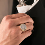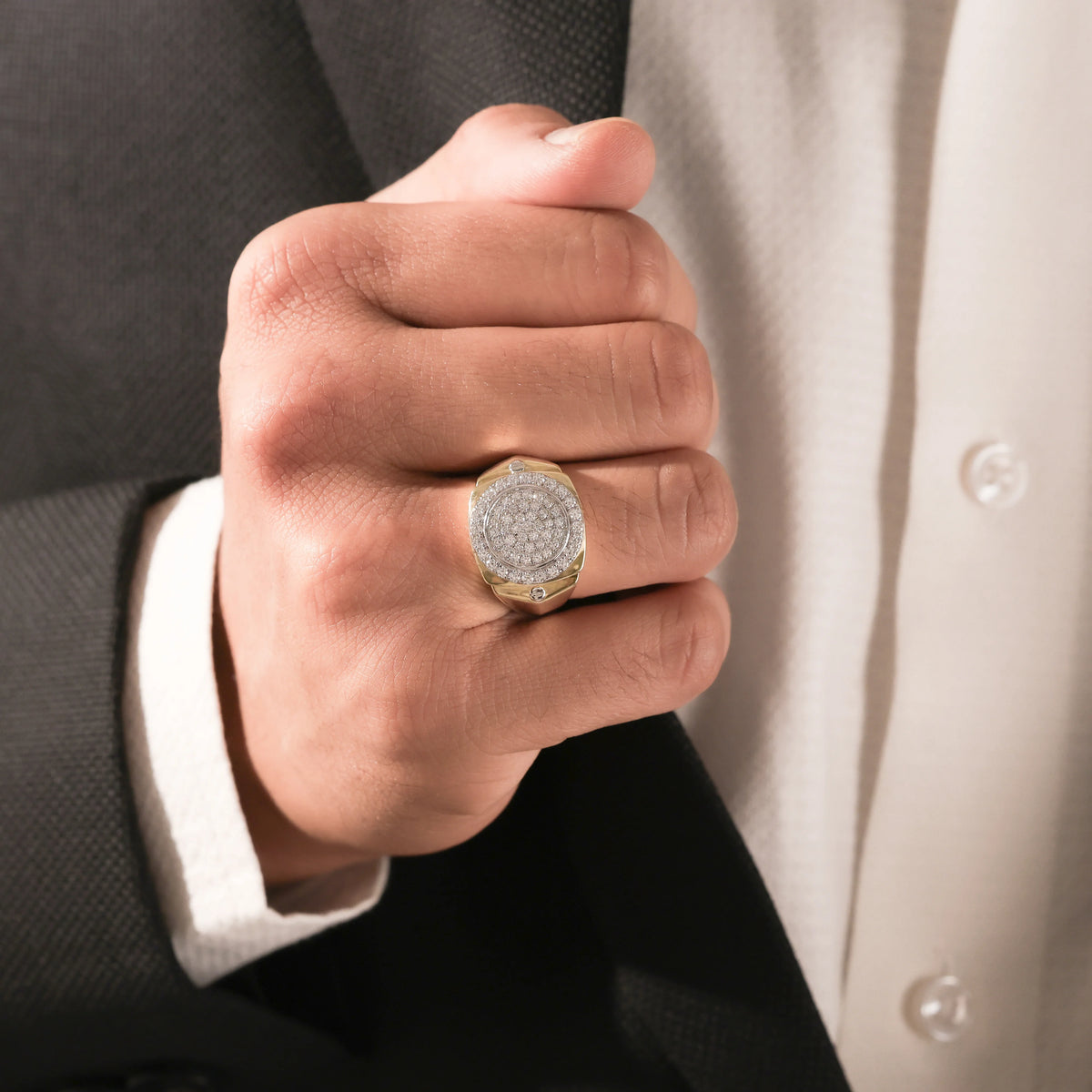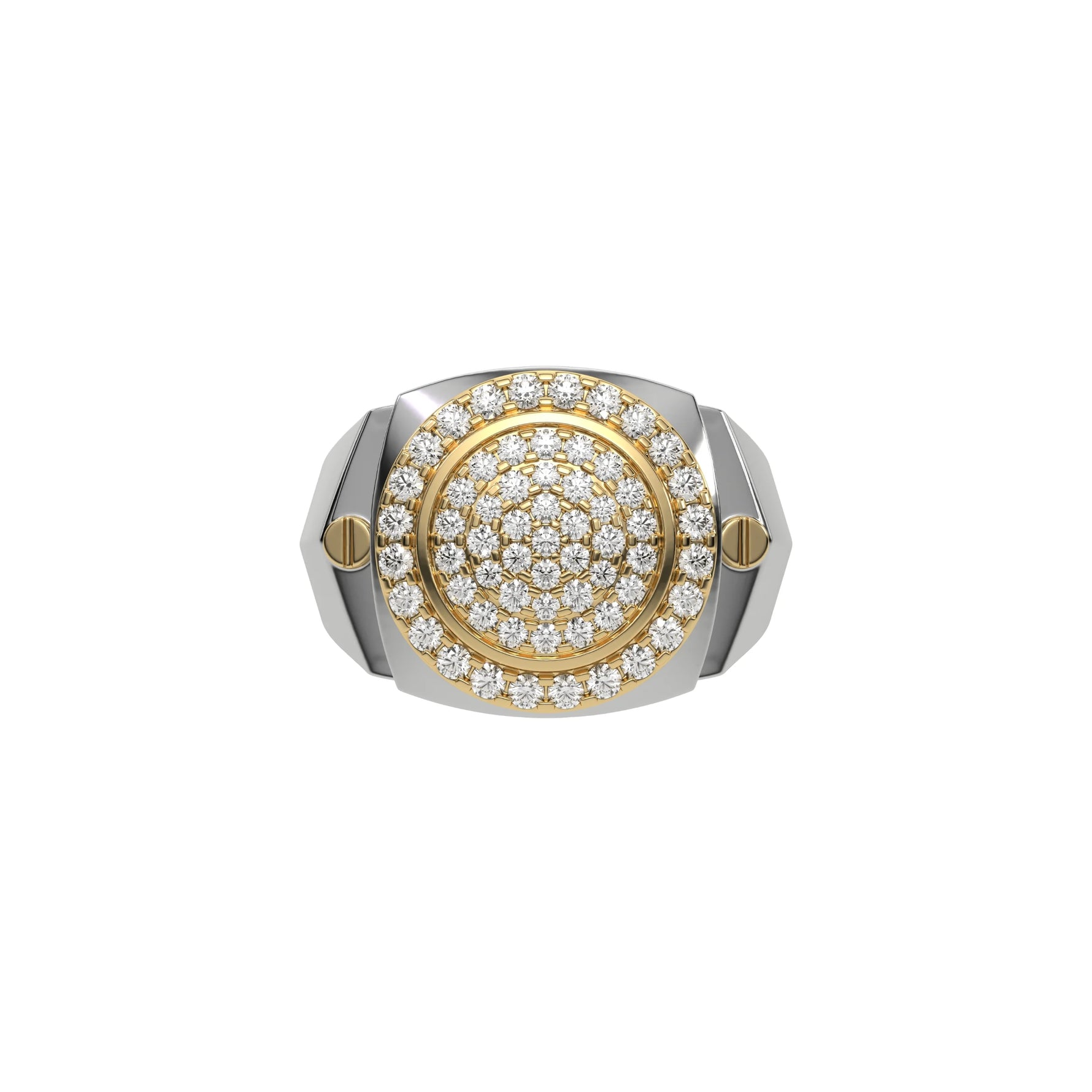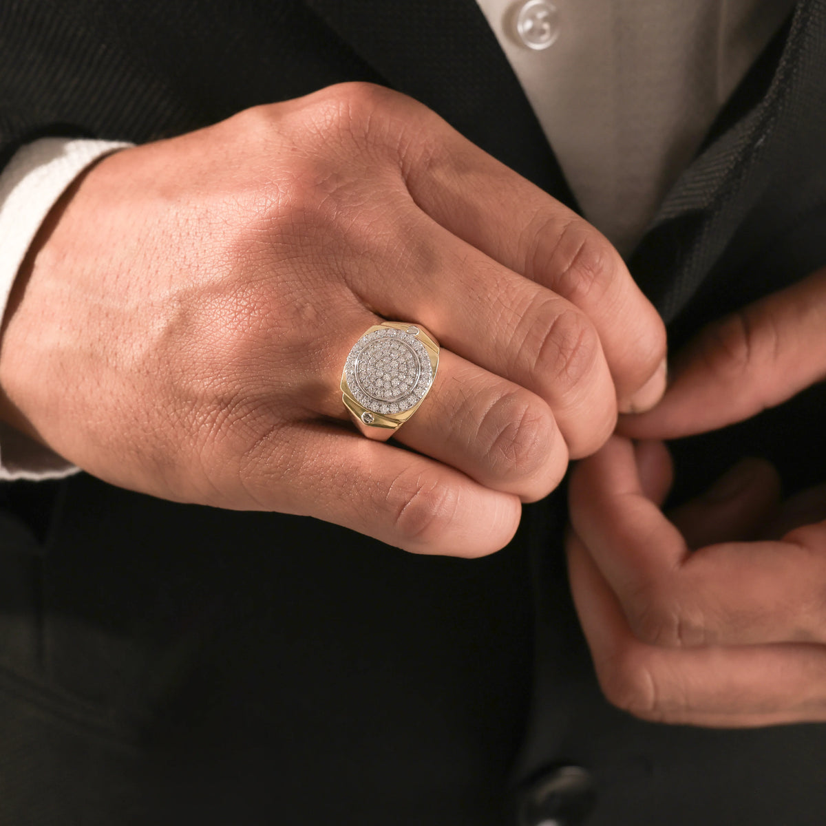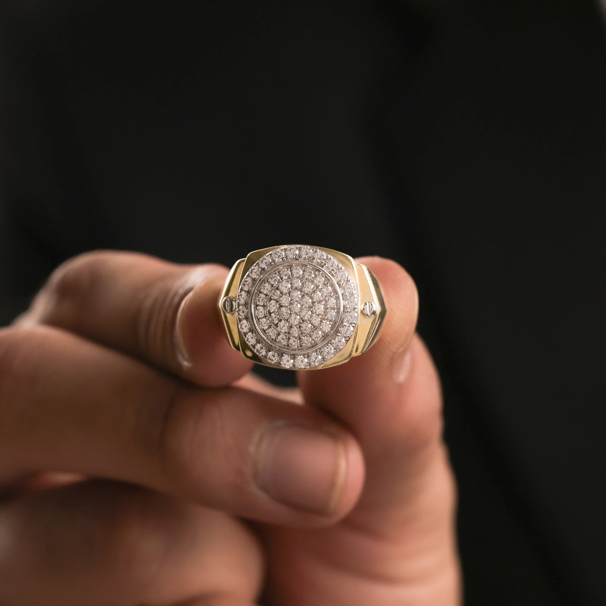 Round diamond signet ring is made from the finest 14K / 18K solid gold and round brilliant cut diamonds. The ring is made from a cluster of round cut diamonds in the center with a metal rim on the outside, complimented by a halo of round diamonds in a shared prong settings.
