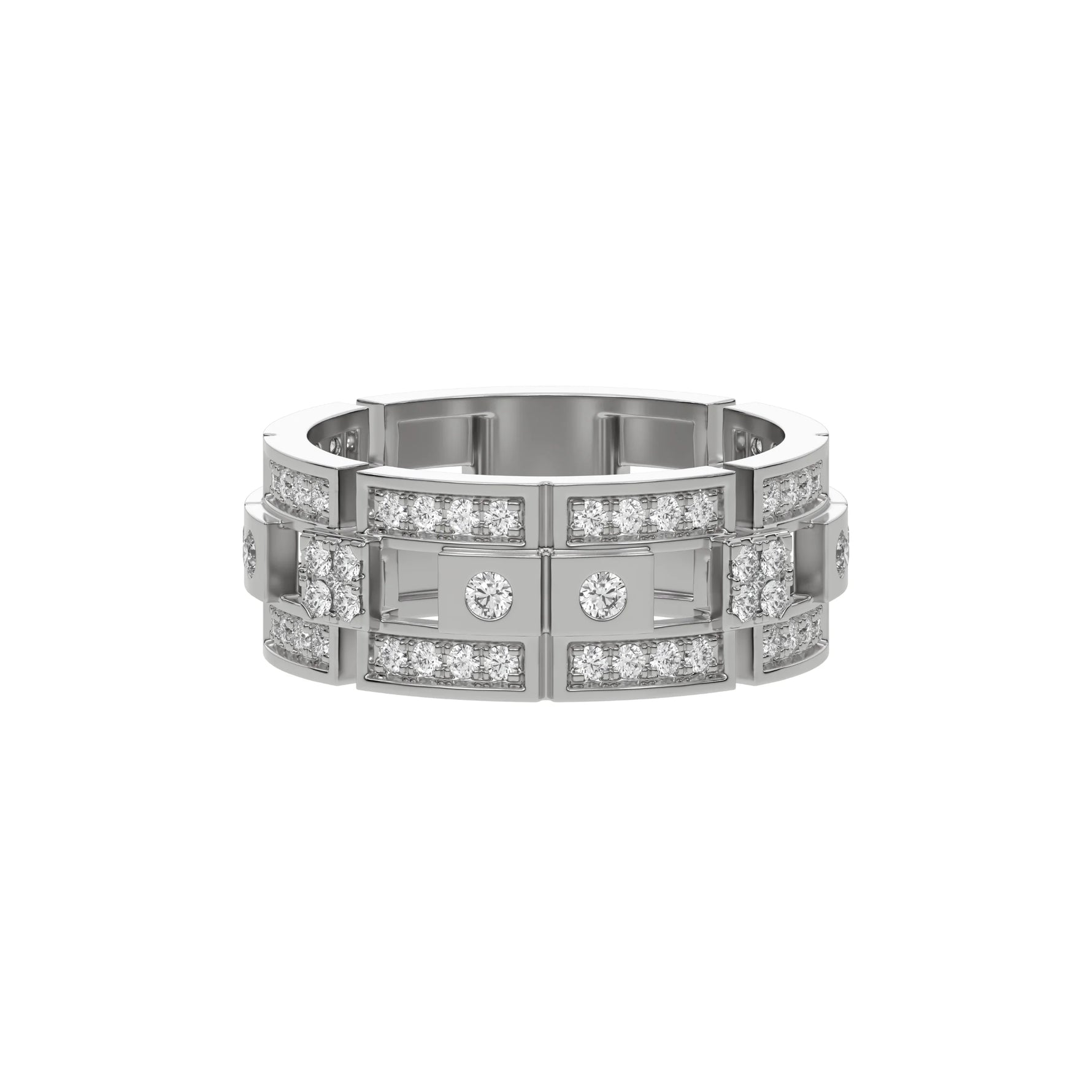This modern two tone diamond eternity ring is made with round brilliant-cut diamonds, about 1.08 carats in total, set carefully in a mix of prong and flush settings.