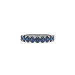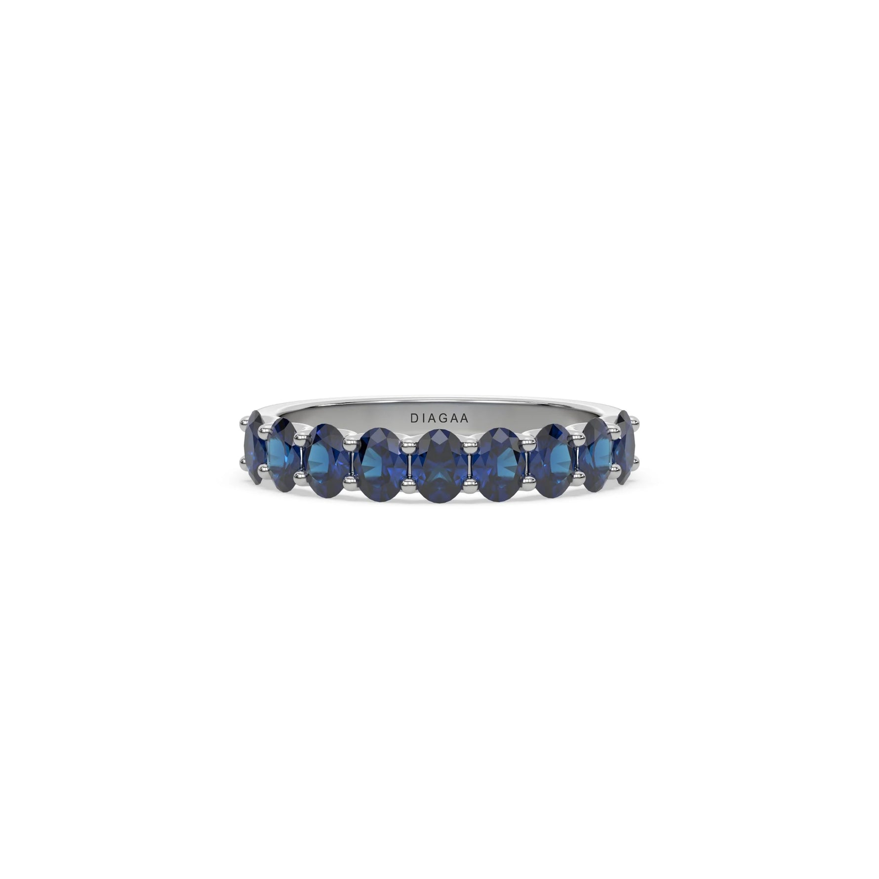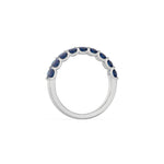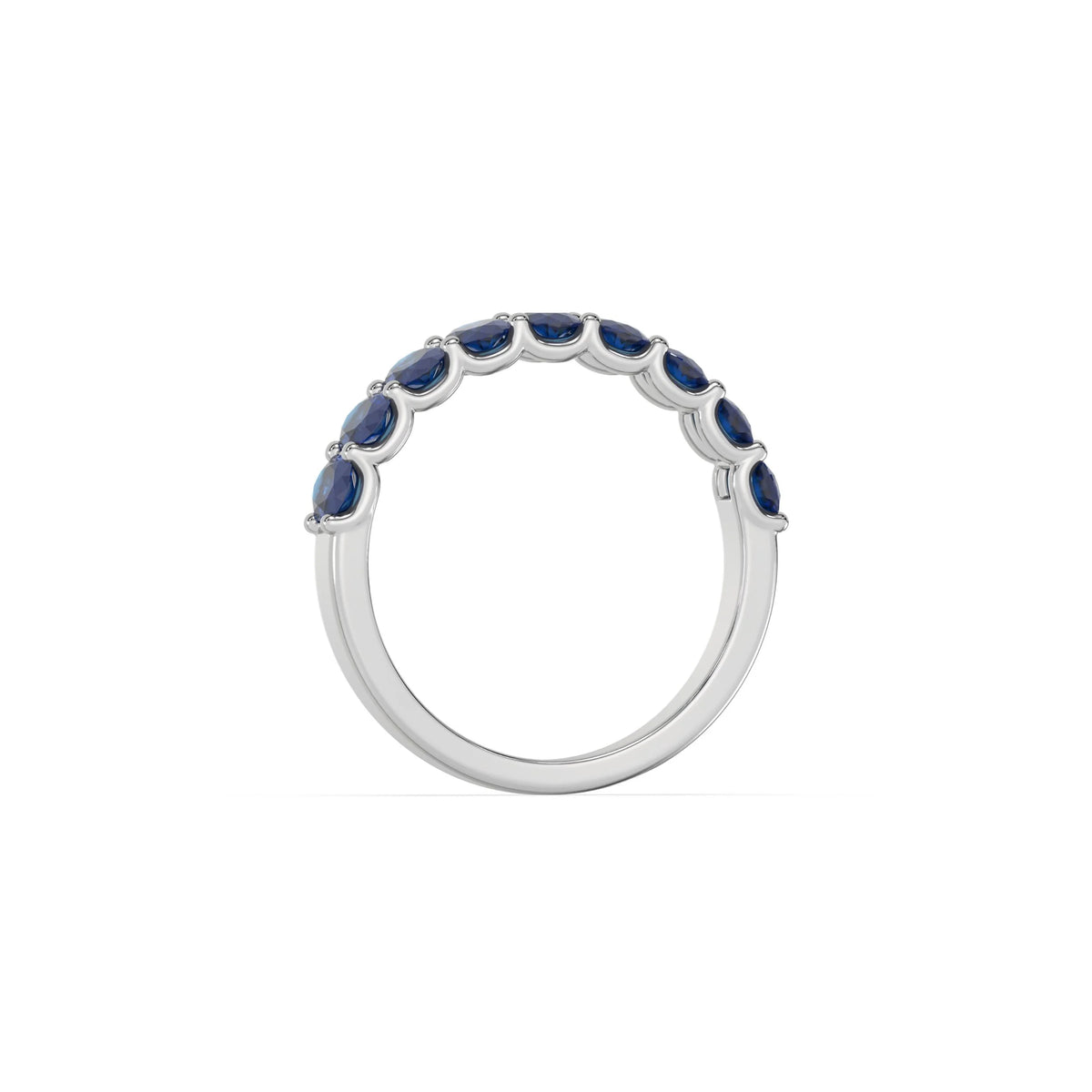 This 4 mm half eternity band features approximately 1.17 carats of oval lab grown blue sapphire gemstones set in shared prong setting.
