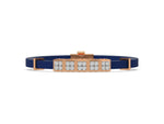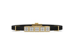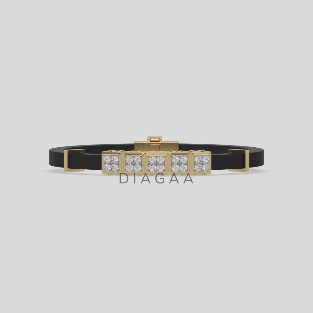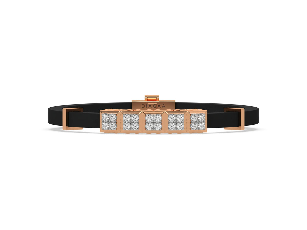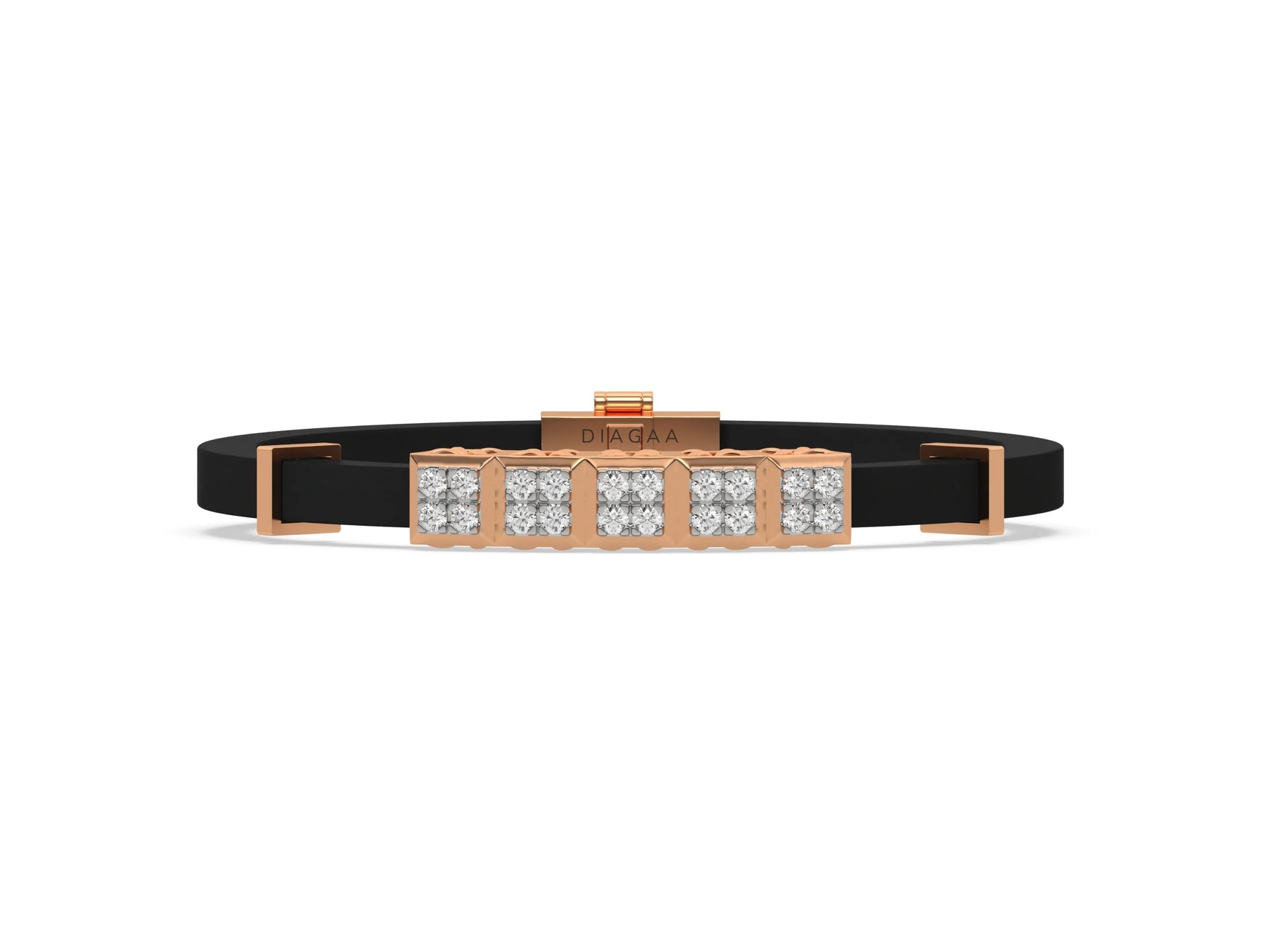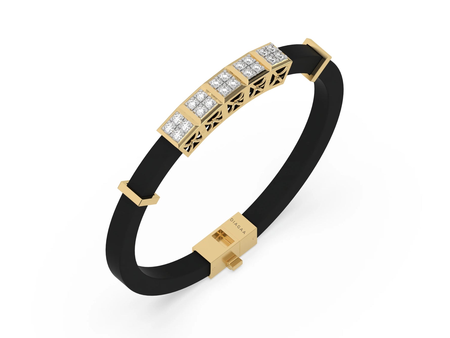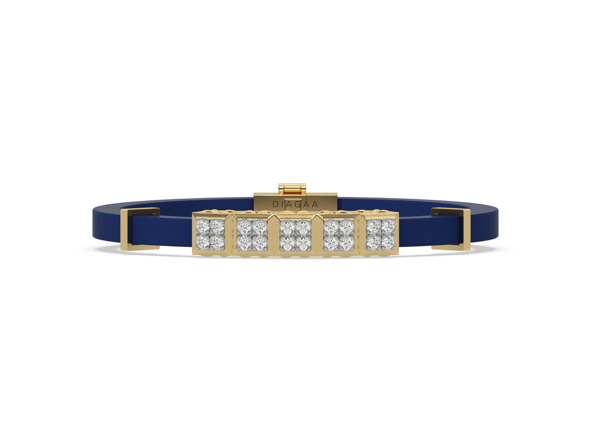 Cubic diamond rubber bracelet features 5 cubic motifs adorned with 20 round-cut diamonds, all meticulously set in a prong setting. Personalize your bracelet by choosing your preferred rubber color (black, brown, or blue) and gold type, available in either 14K or 18K gold.