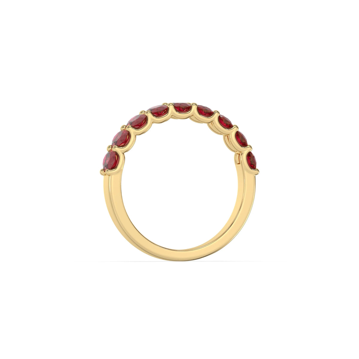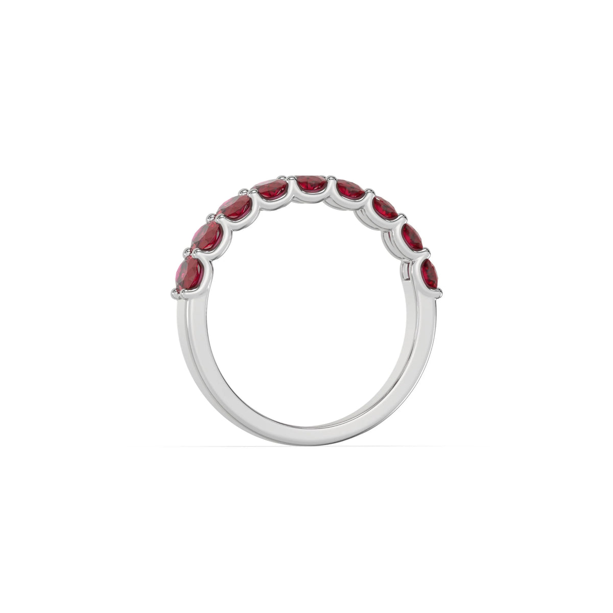 This 5 mm half eternity band features approximately 1.89 carats of oval lab grown ruby gemstones set in shared prong setting.