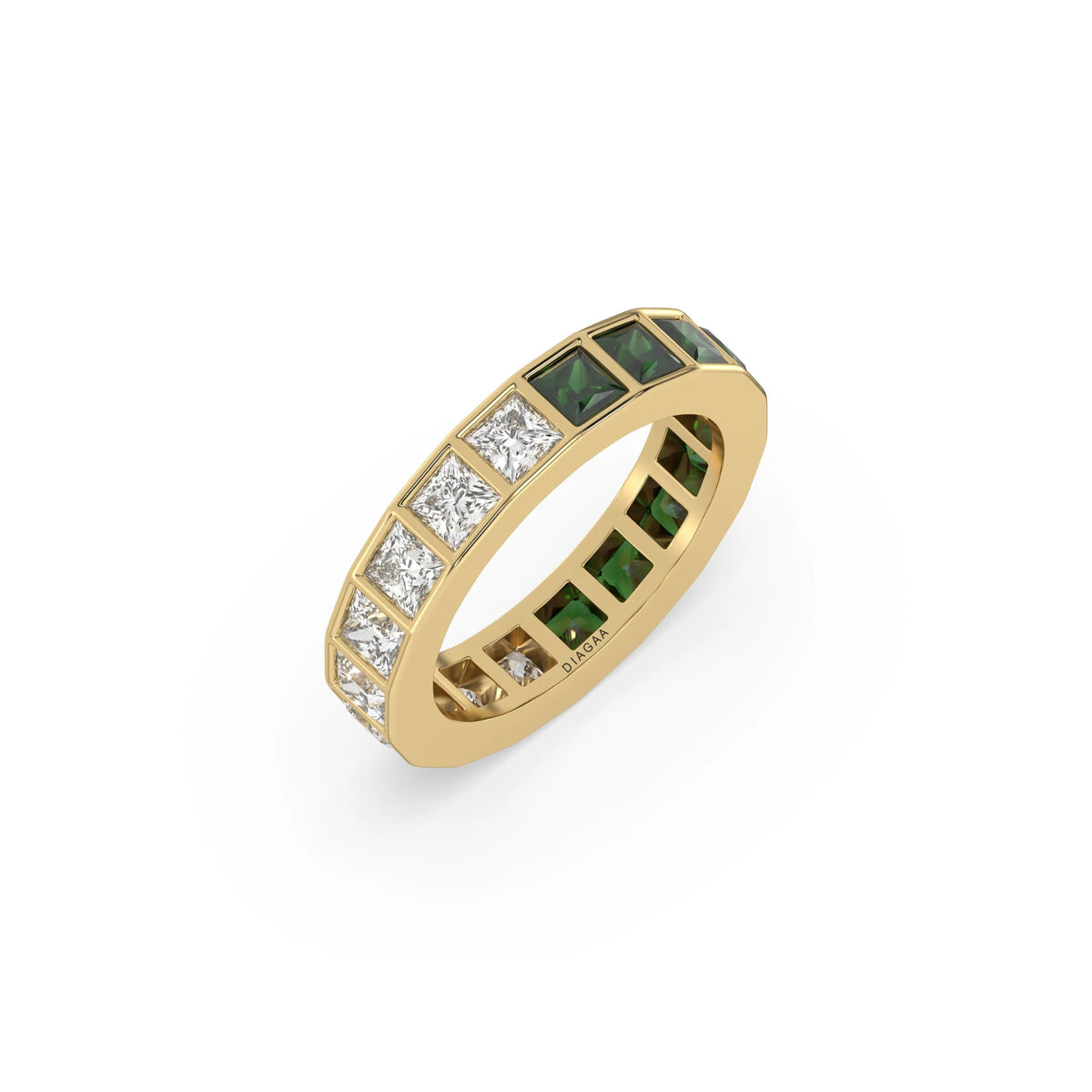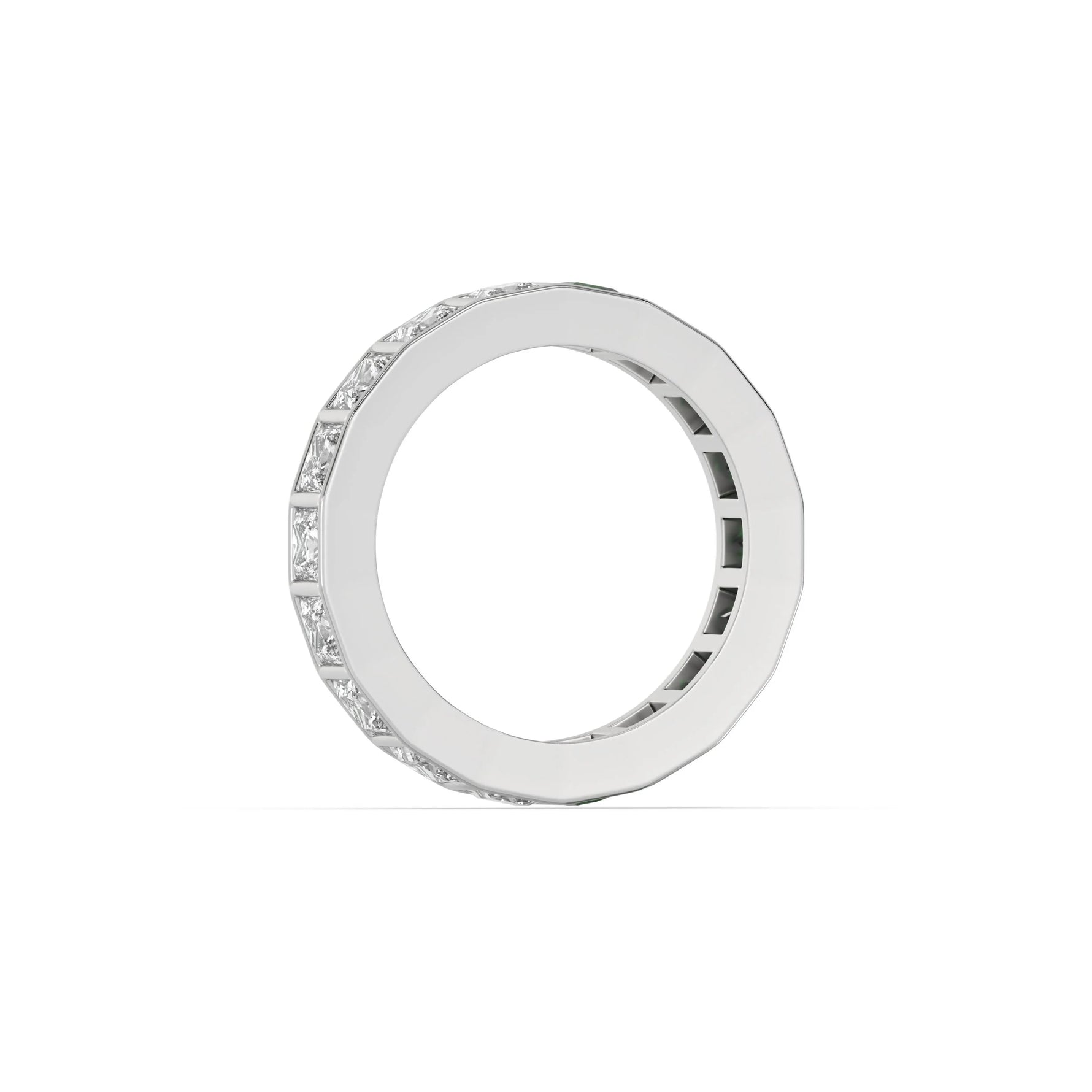 This 4 mm half emerald and half lab diamond full eternity band features approximately 1.71 carats of princess lab grown diamonds and 1.71 carats of lab grown emerald gemstones, set in a bezel setting.