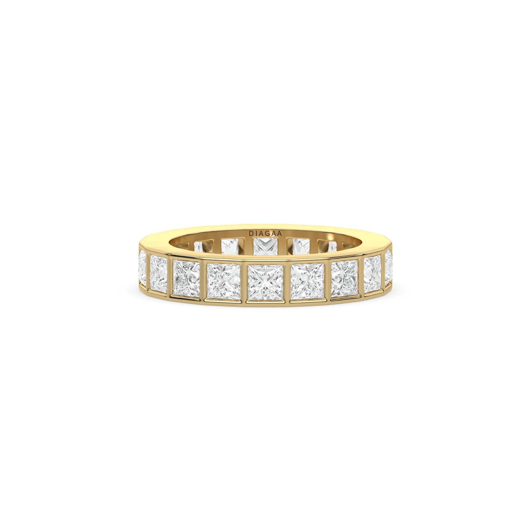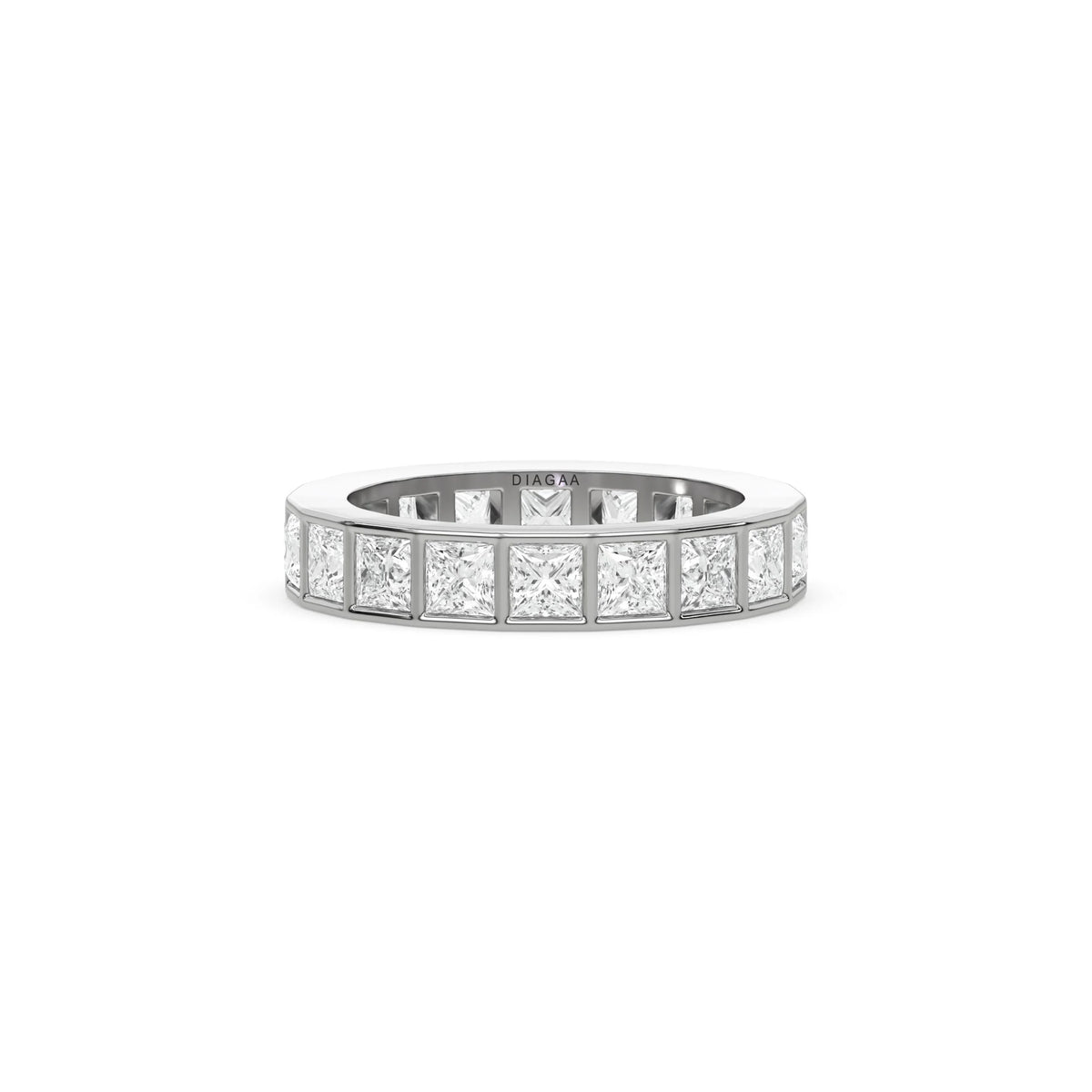 This 4 mm full eternity band features approximately 3.42 carats of princess lab grown diamonds set in bezel setting.