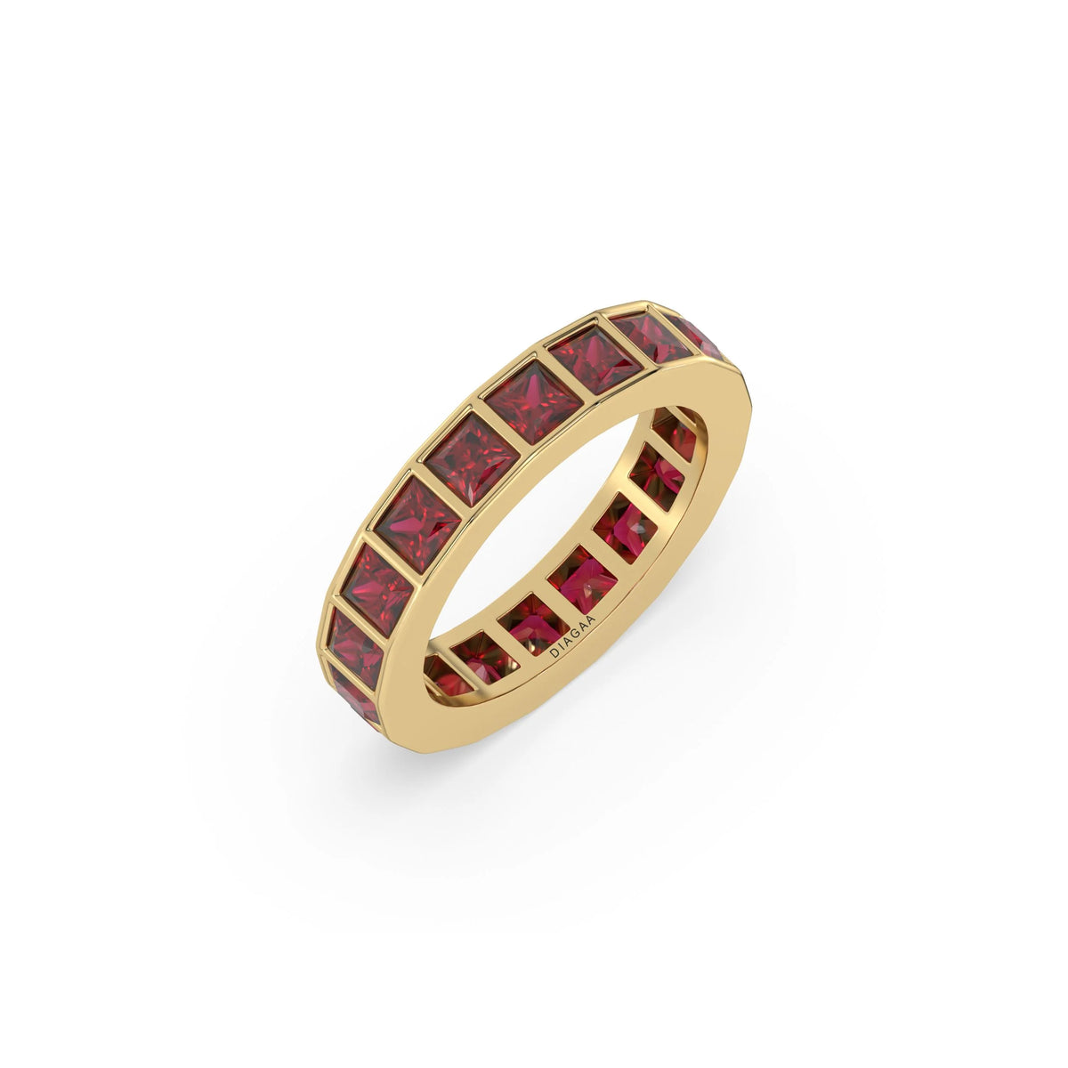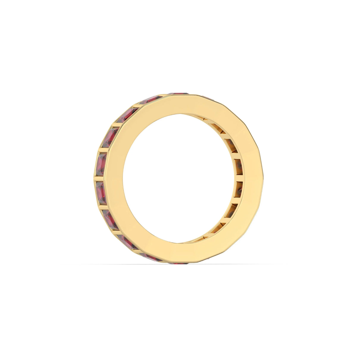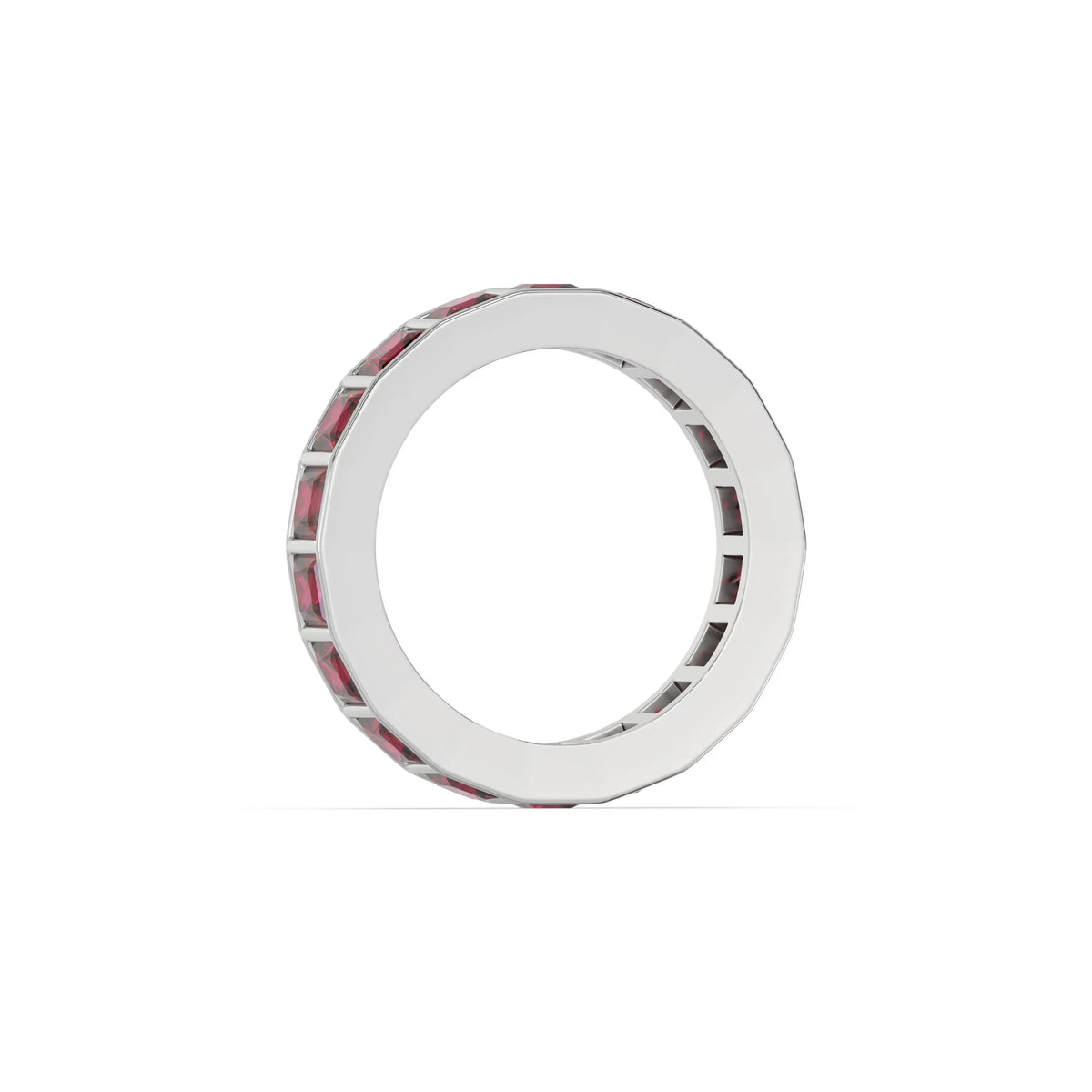 This 4 mm full eternity band features approximately 3.42 carats of princess lab ruby gemstones set in bezel setting.