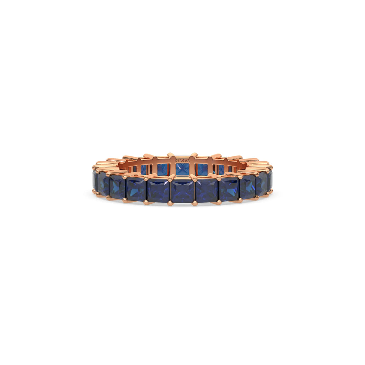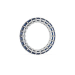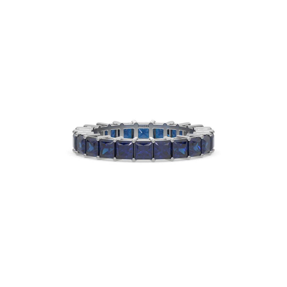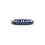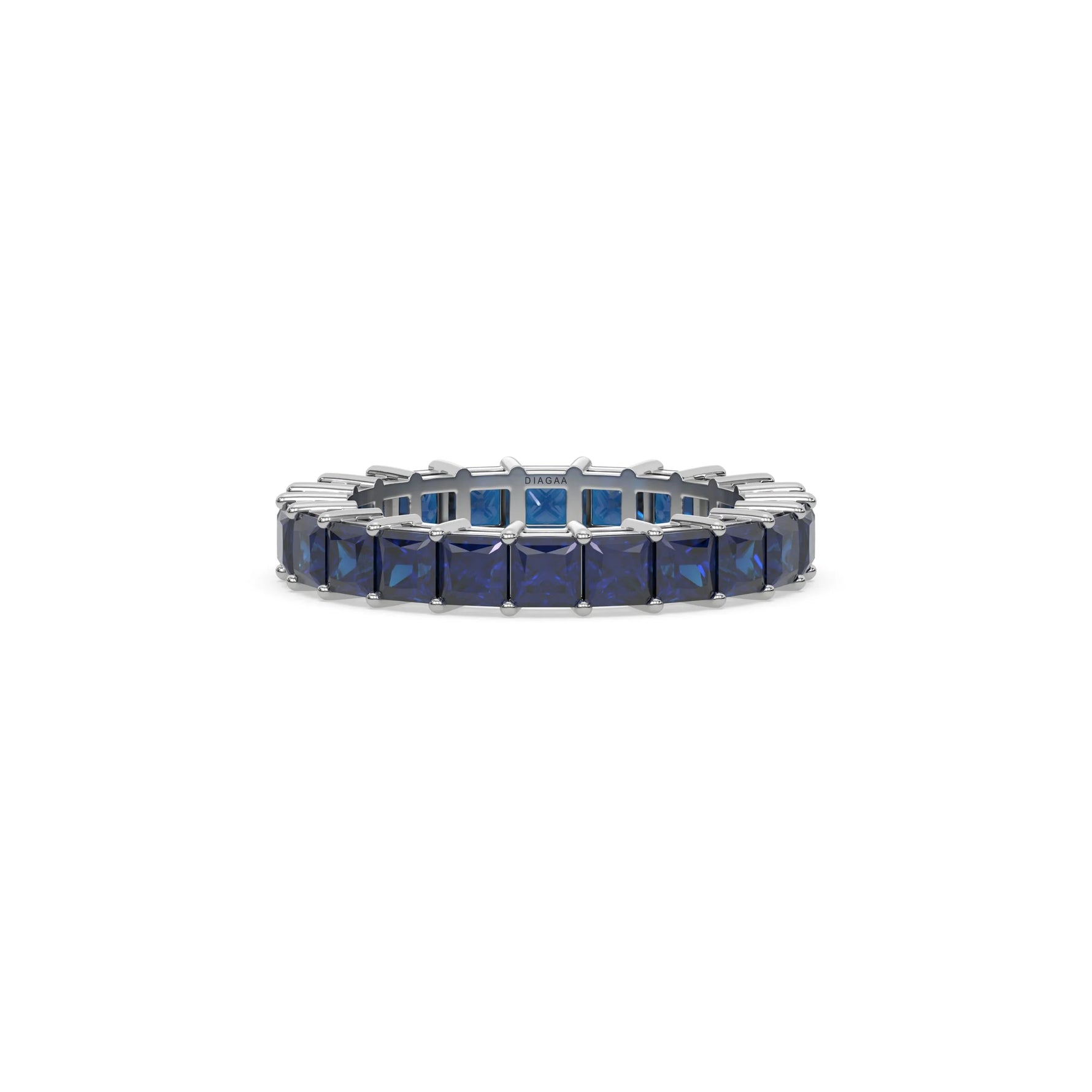 This 3.5 mm full eternity band features approximately 5.60 carats of princess lab blue sapphire gemstones set in prong setting.