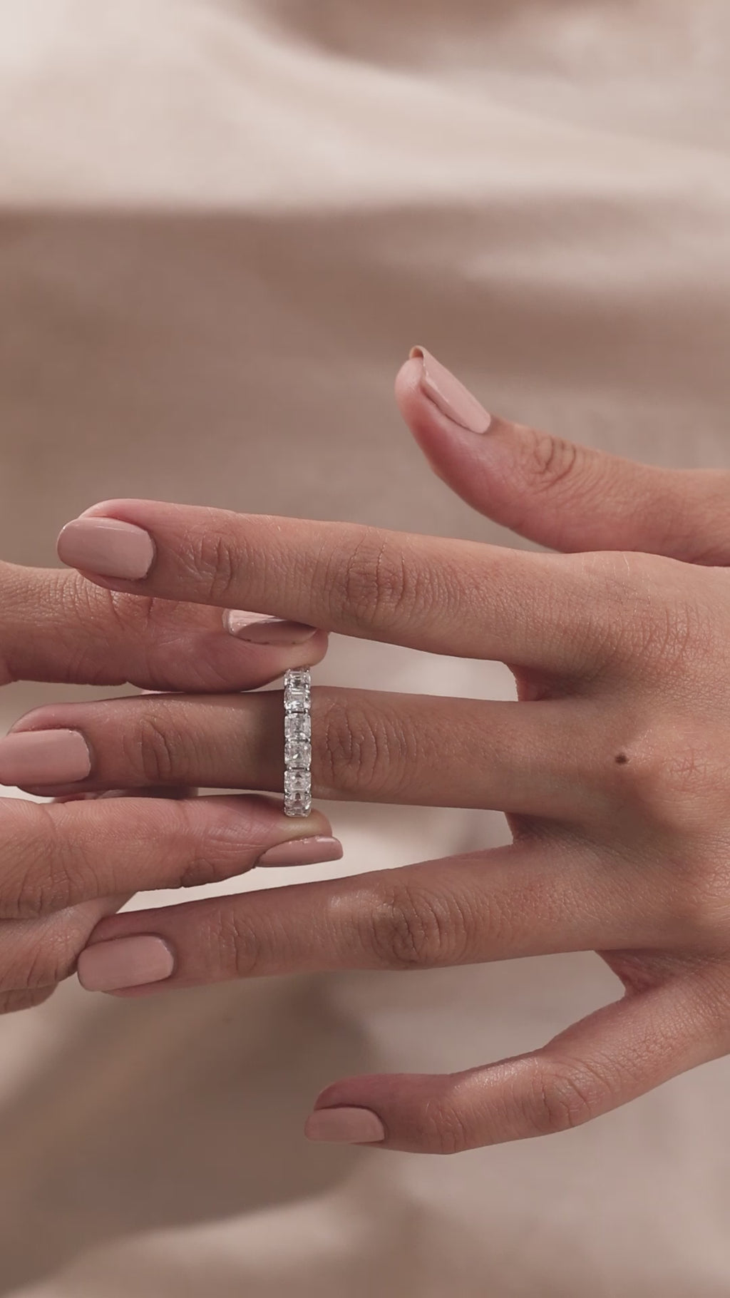 This 4.5 mm full eternity band features approximately 8.80 carats of asscher lab grown diamonds set in prong setting.