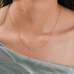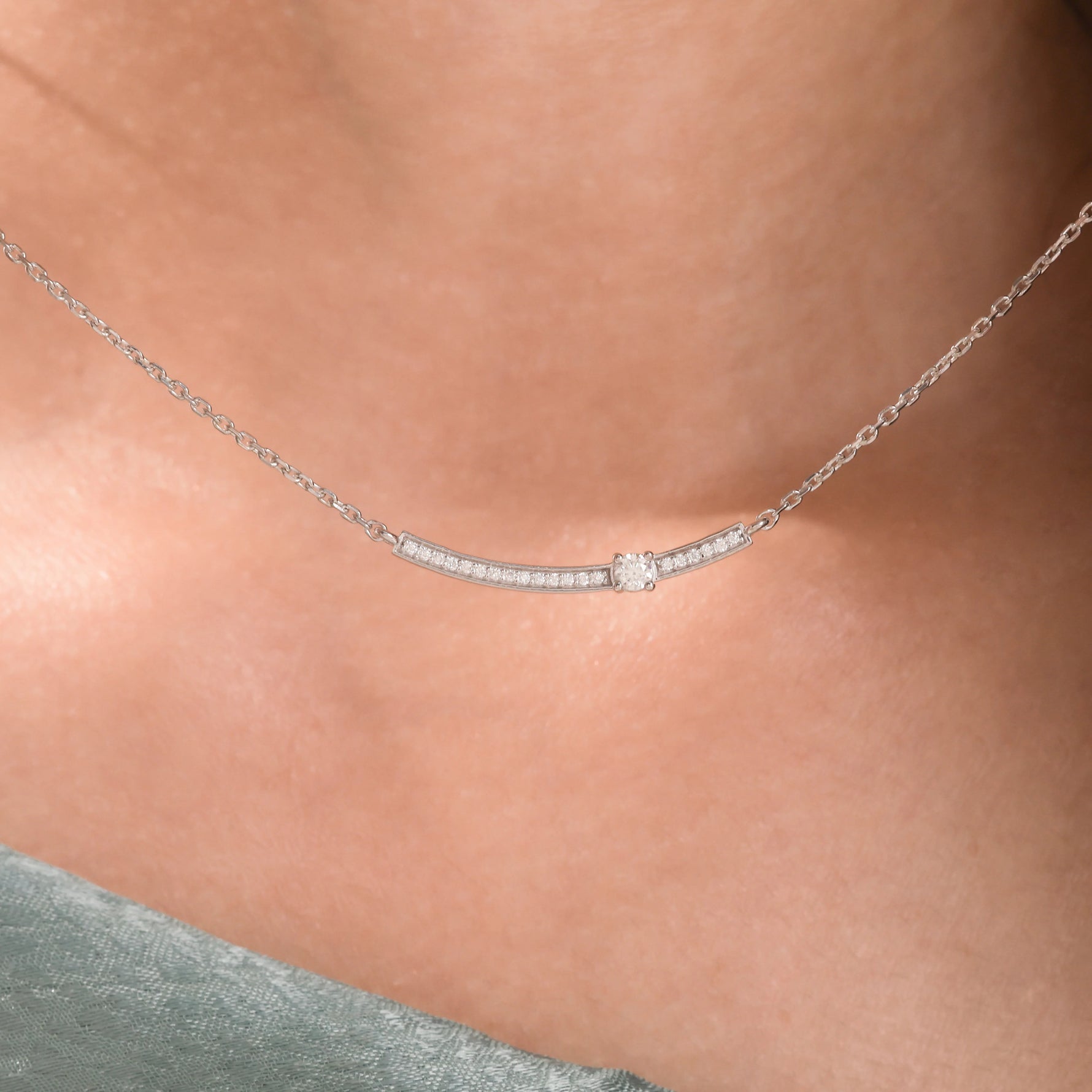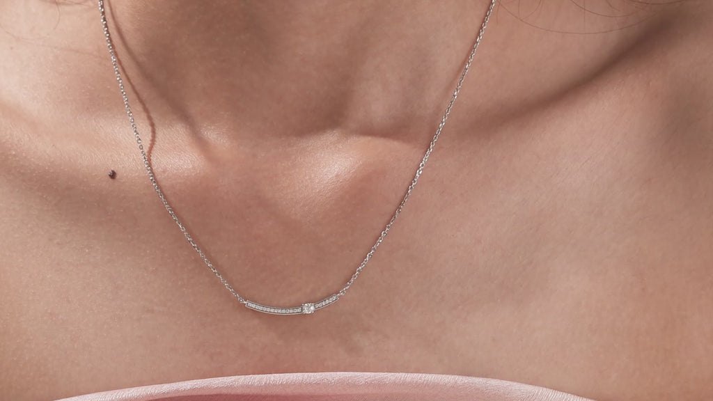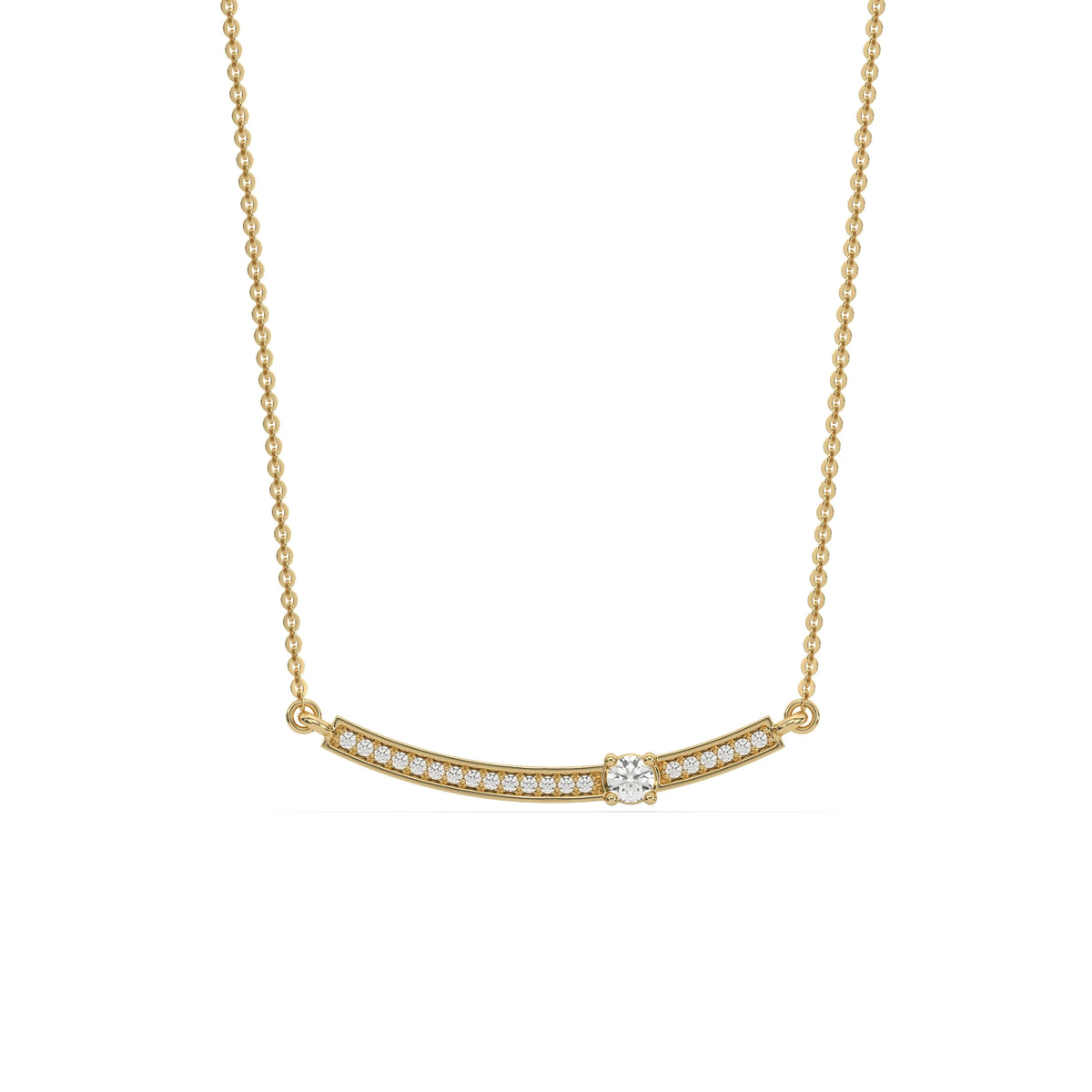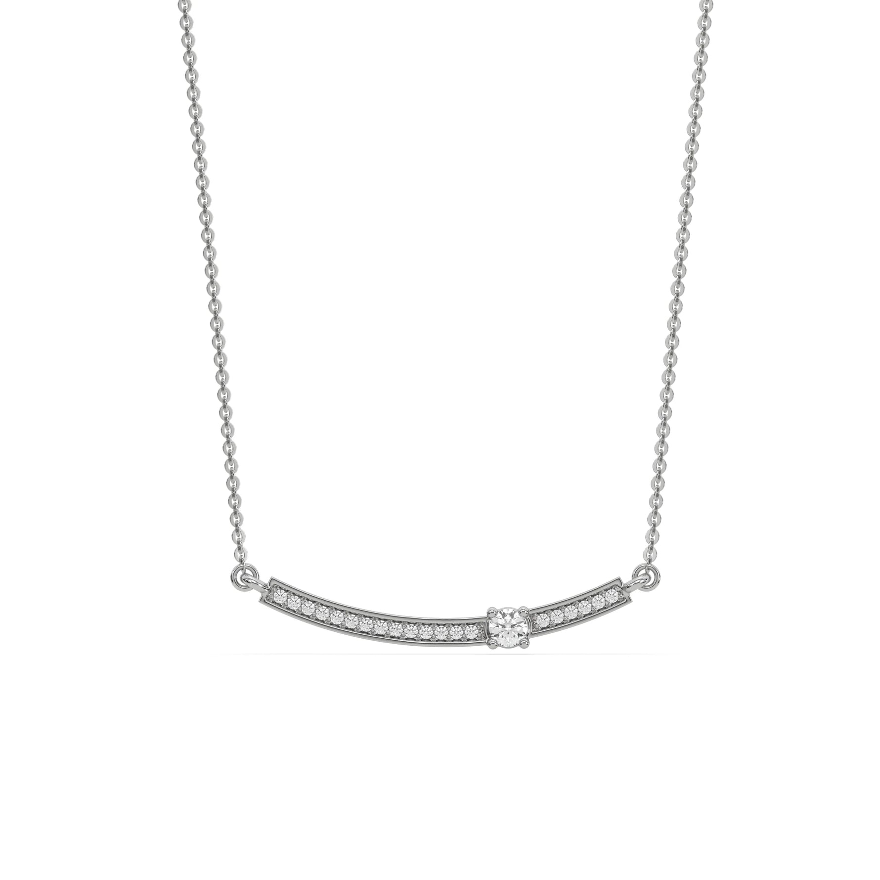Curved Bar Diamond Necklace made with round brilliant-cut diamond in pave setting with a round solitaire on top set at an angle with adjustable chain.Β