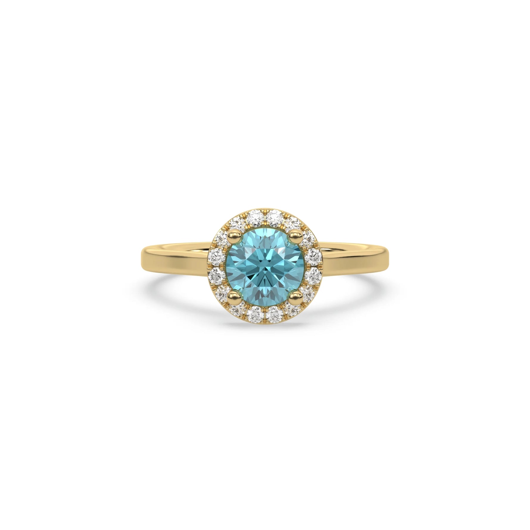 This ring features a fancy Blue round solitaire diamond set in a four-prong setting, surrounded by a halo of round diamonds, all resting on a delicate gold band.