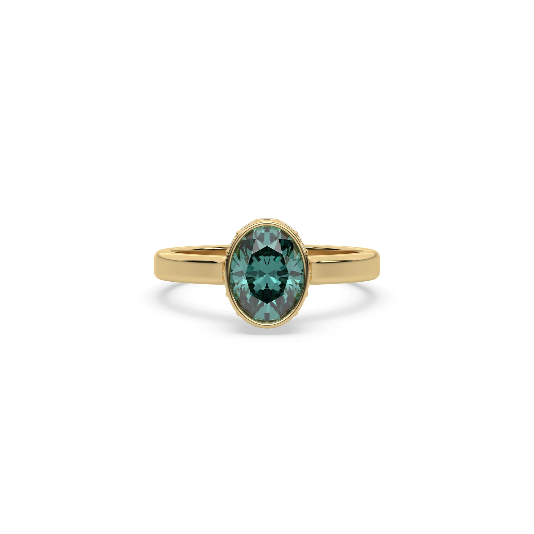 Fancy Green Oval Diamond Hidden Halo Engagement Ring is made with an fancy Green oval diamond, set in a bezel setting with a hidden-halo of round diamonds all set in a pave setting on a solid gold band.