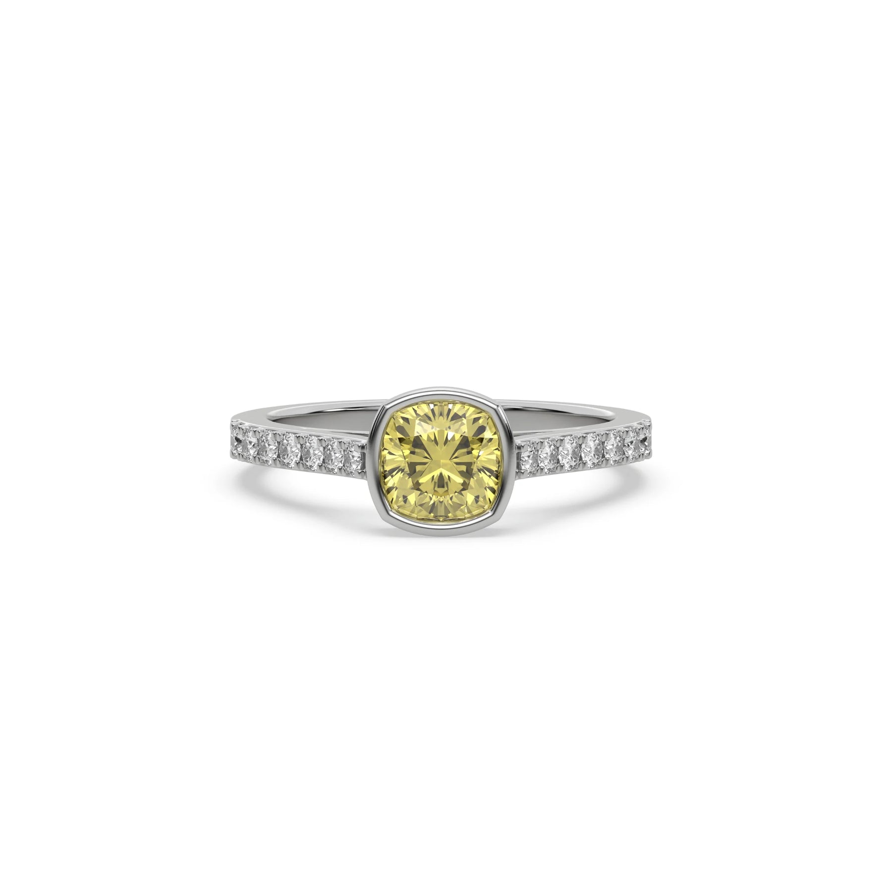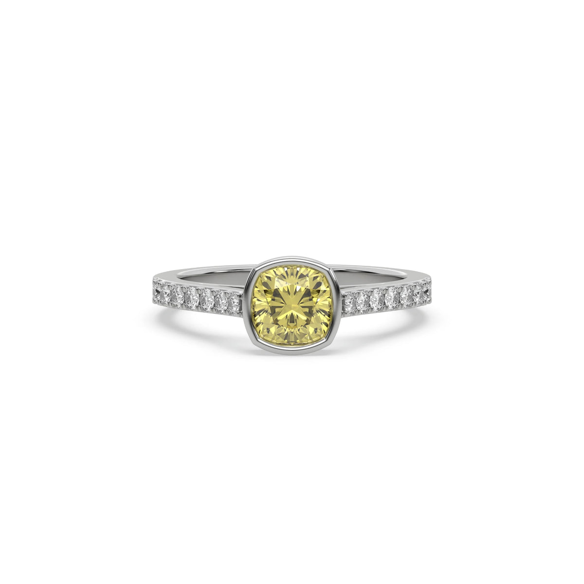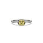 Fancy Yellow Cushion Diamond Bezel Engagement Ring is made with a fancy yellow cushion cut diamond set in a bezel setting on a pave diamond band made with round brilliant cut diamonds.