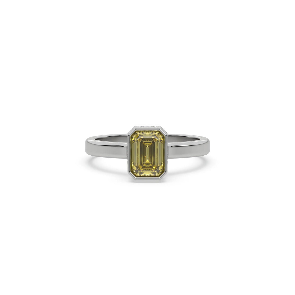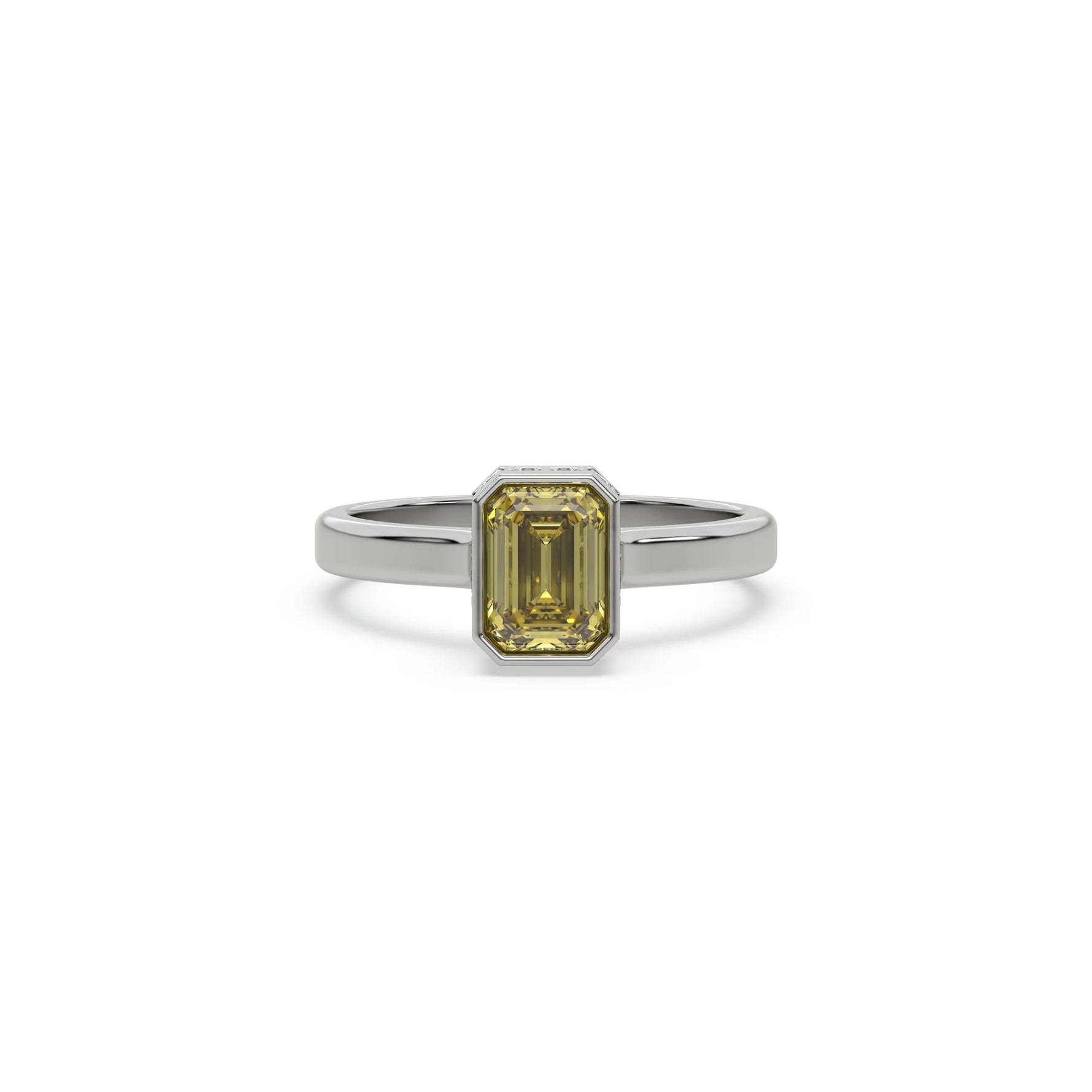 Fancy Yellow Emerald Diamond Hidden Halo Engagement Ring is made with an fancy yellow emerald cut diamond set in a bezel setting with a hidden-halo of round diamonds all set in a pave setting on a solid gold band.