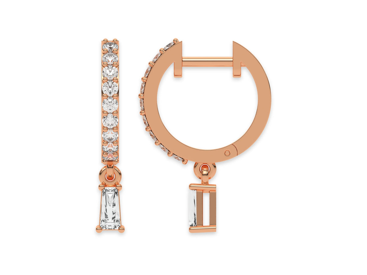 Dangling Baguette Diamond Hoop Earrings handmade with round brilliant-cut diamonds in prong setting and a baguette solitaire hanging at the bottom.