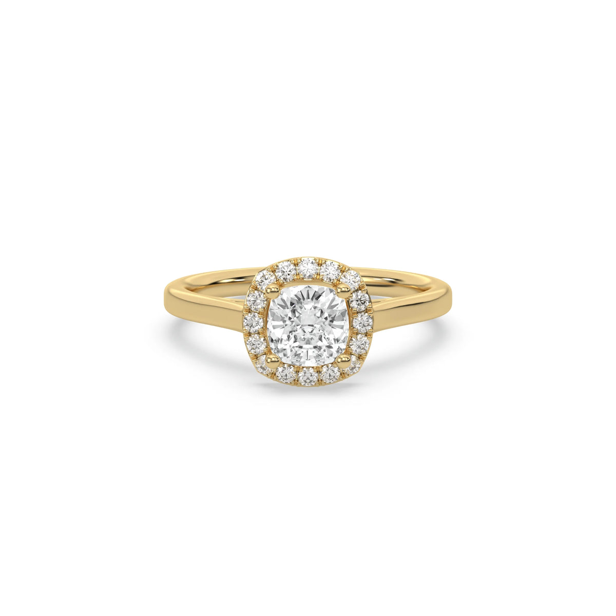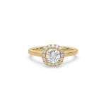 This ring features a cushion solitaire diamond set in a four-prong setting, surrounded by a halo of round diamonds, all resting on a delicate gold band.