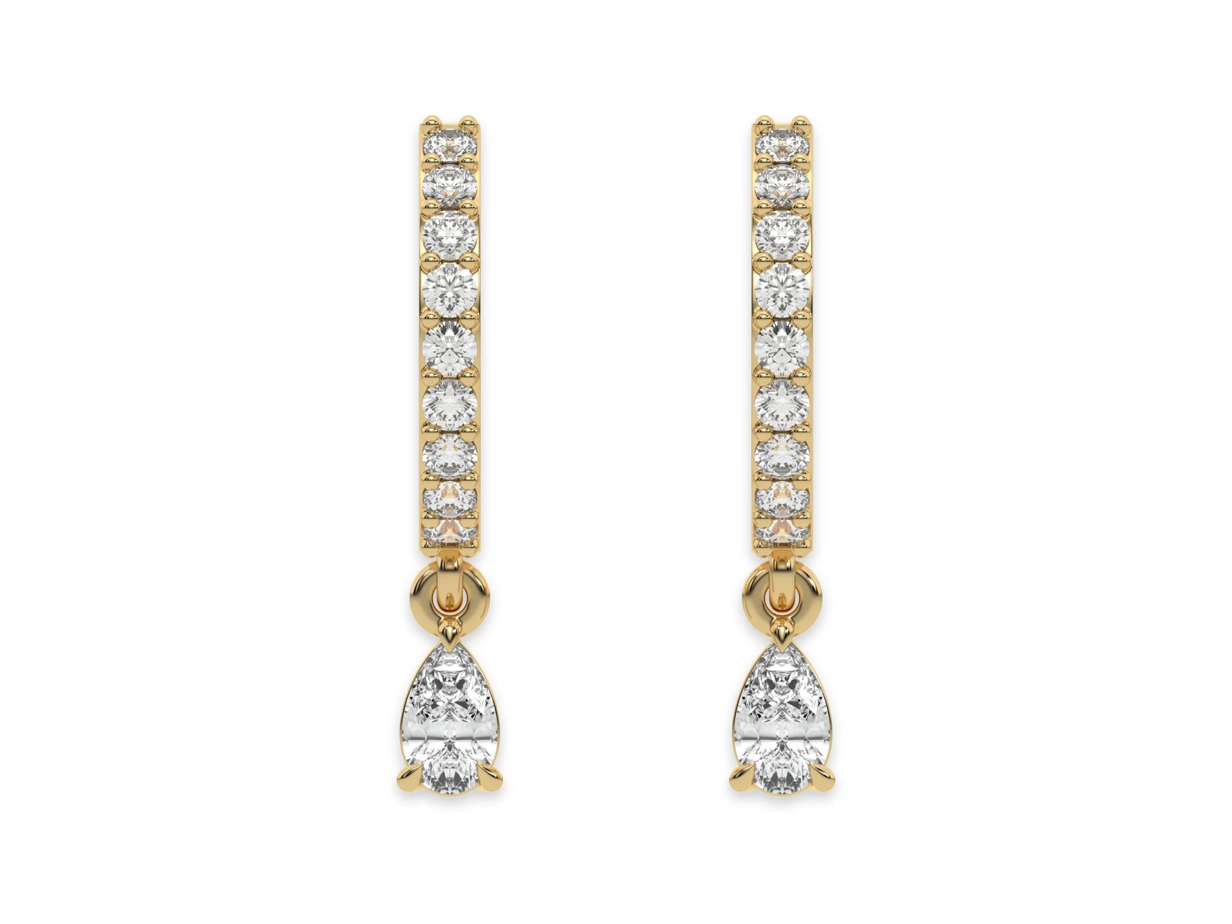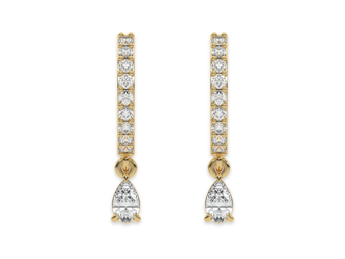 Dangling Pear Diamond Hoops made with round brilliant-cut diamonds in prong setting and a pear solitaire hanging at the bottom.