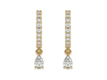 18k yellow gold dangling pear diamond hoop earrings with a round cut diamond in prong setting.