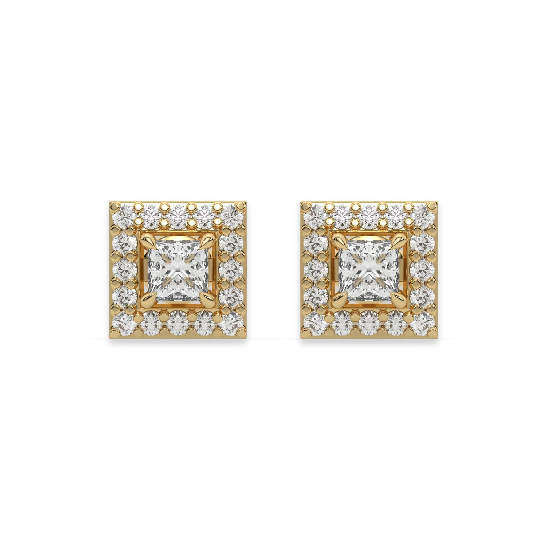 18k yellow gold Princess Diamond Halo Earrings made with a princess cut solitaire diamonds set in a four prong setting