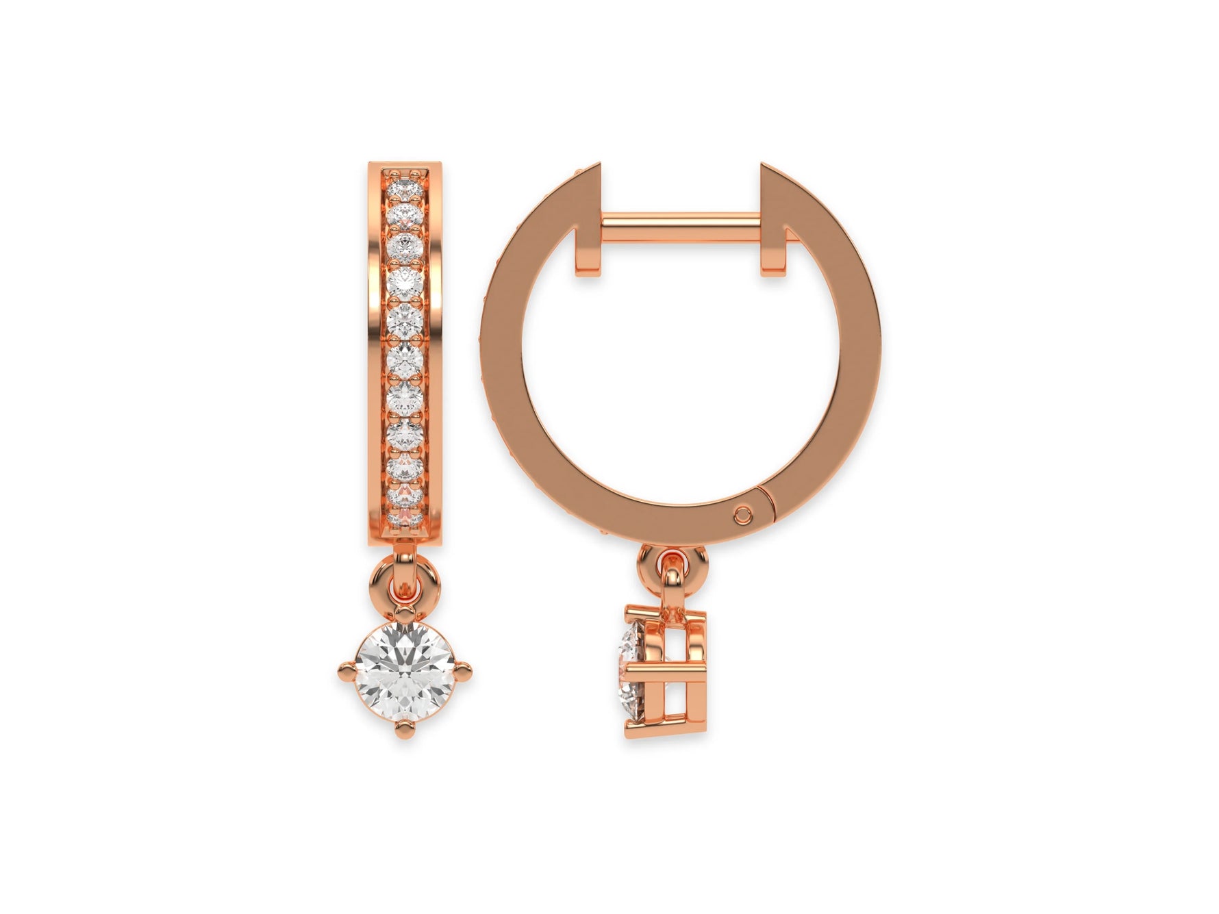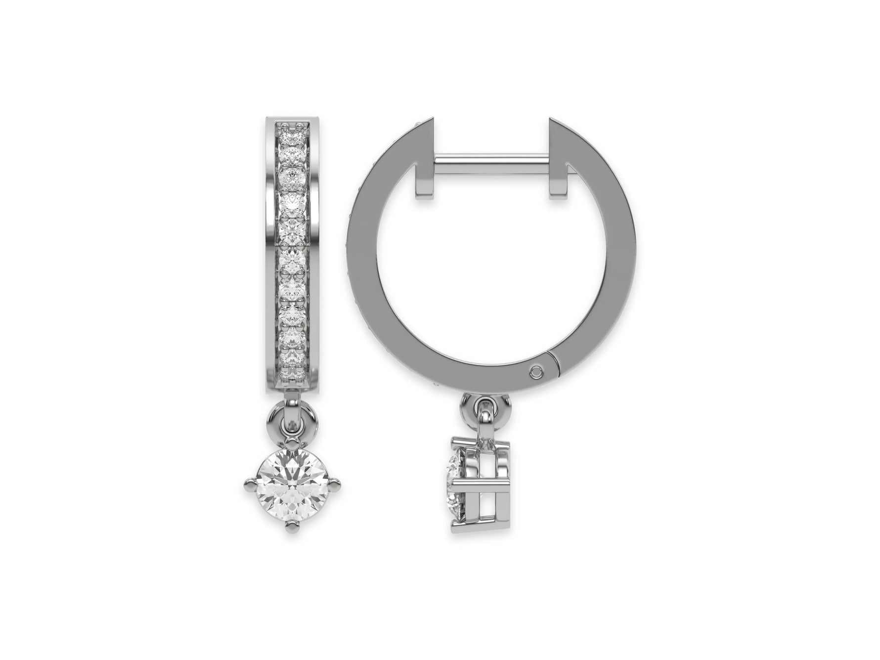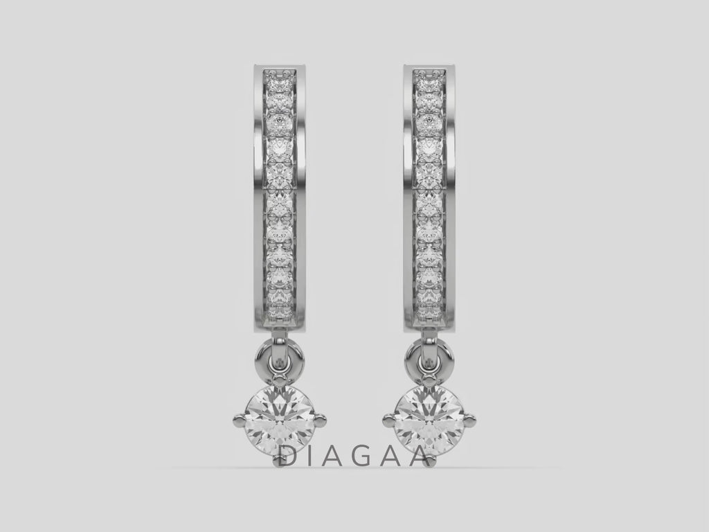 Dangling Round Diamond Hoop Earrings handmade with round brilliant-cut diamonds in pave setting and a round solitaire hanging at the bottom.