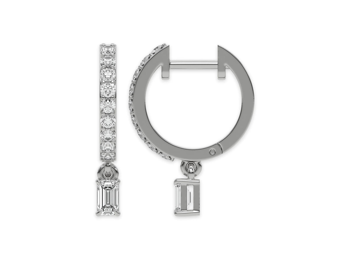 10k white gold dangling natural emerald diamond hoop earrings with round cut diamonds in prong setting in hoop and an emerald solitaire hanging at the bottom.