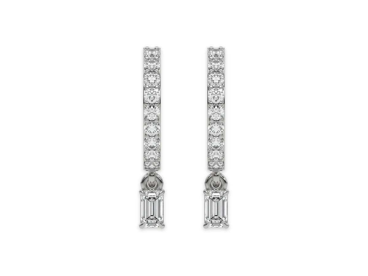 Dangling Emerald Diamond Hoop Earrings made with round brilliant-cut diamonds in prong setting and an emerald solitaire hanging at the bottom.Β