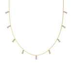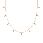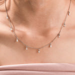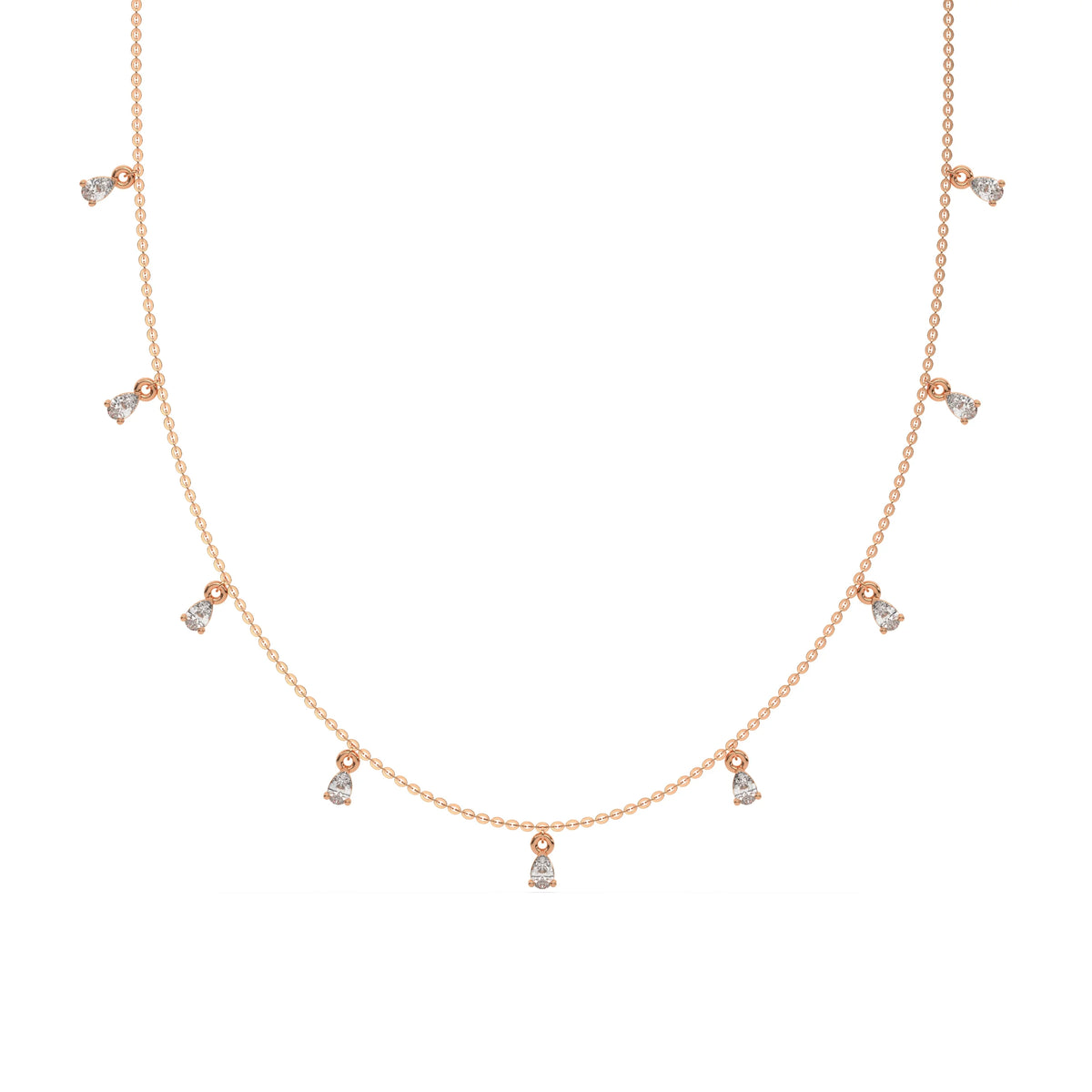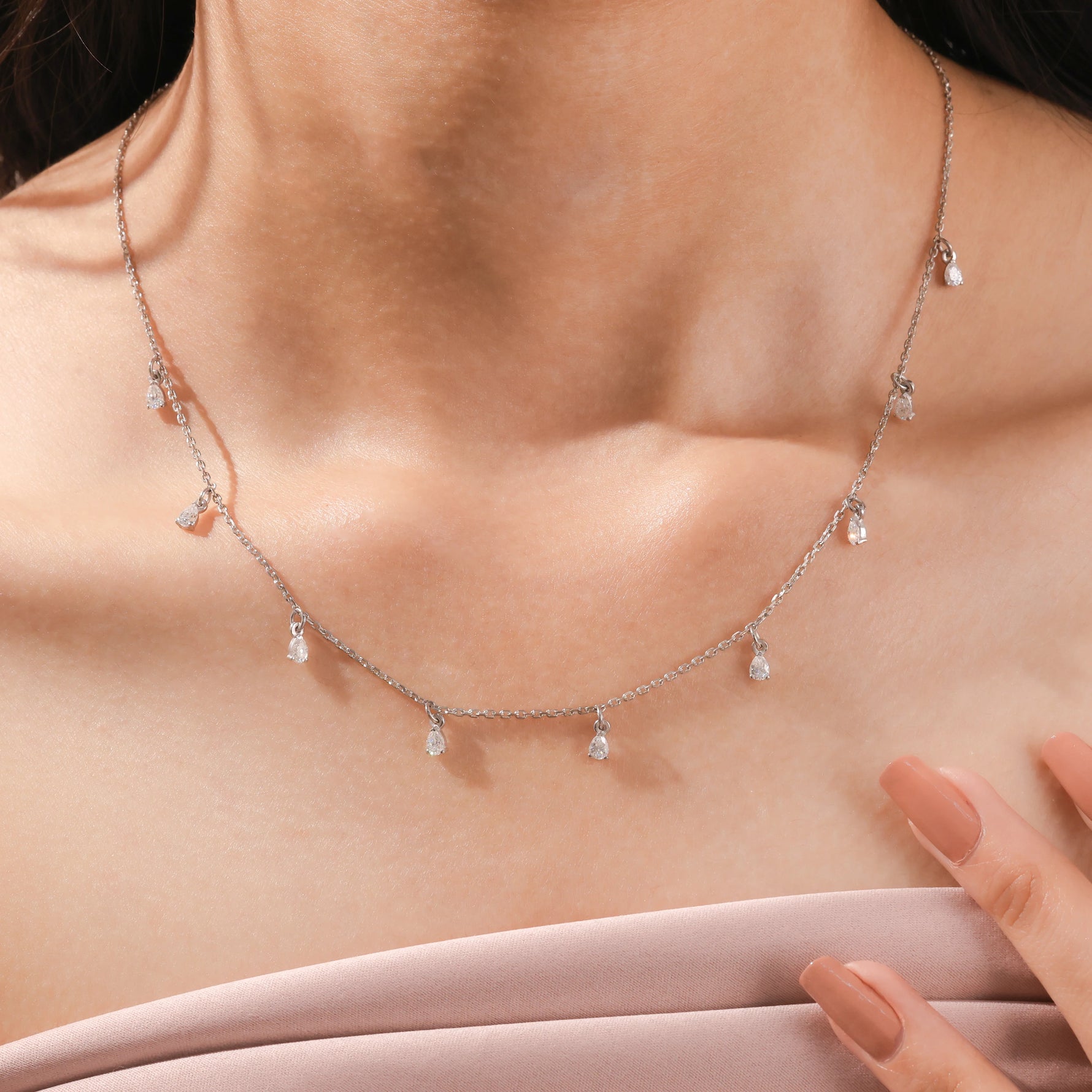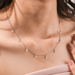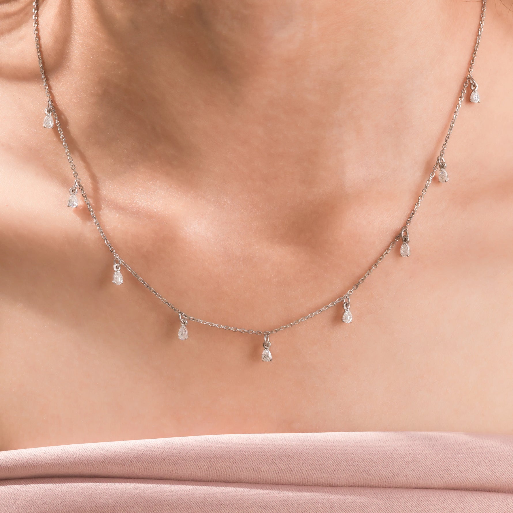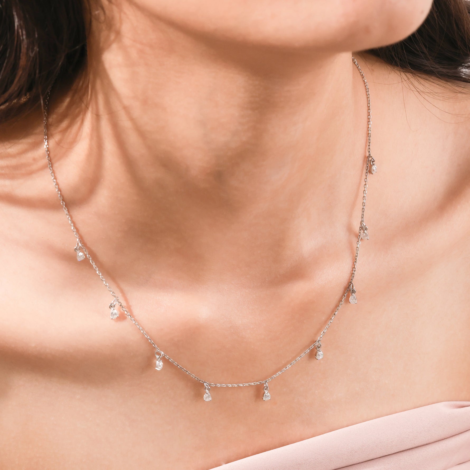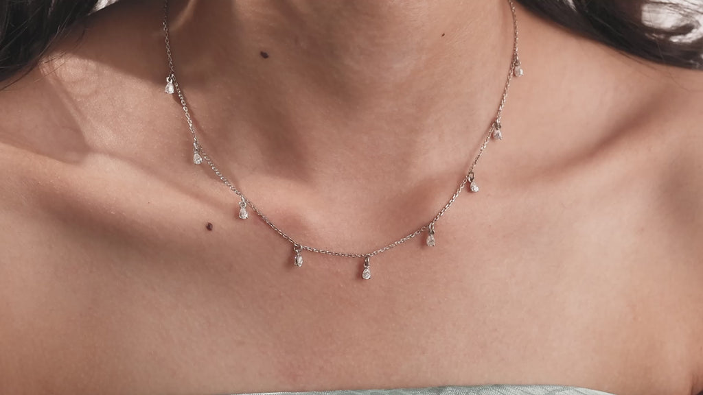 Pear Dangling Diamond Necklace made with nine pear cut diamonds each set in a prong setting, distributed evenly along the chain.