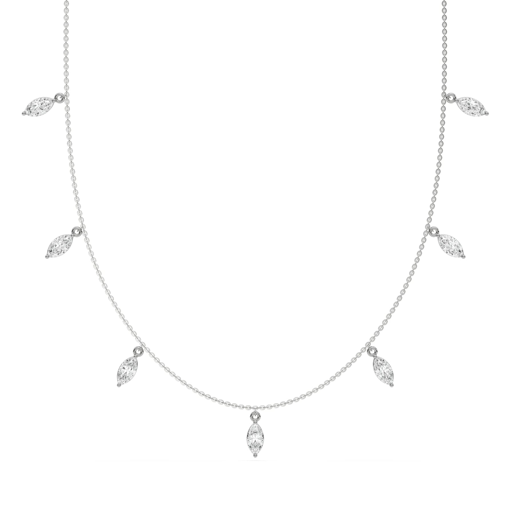 Marquise Dangling Diamond Necklace made with seven marquise cut diamonds each set in a prong setting, distributed evenly along the chain.