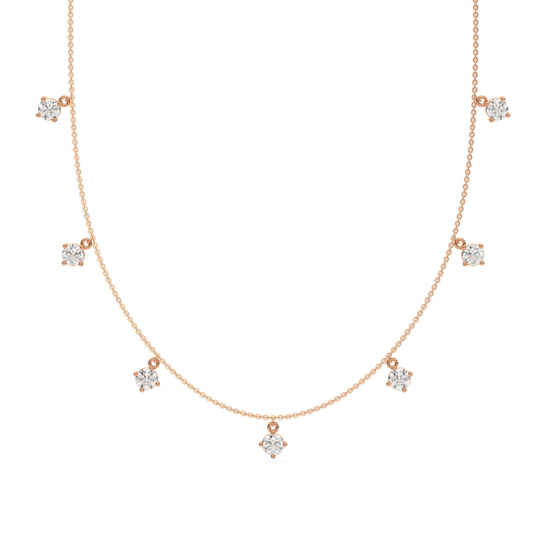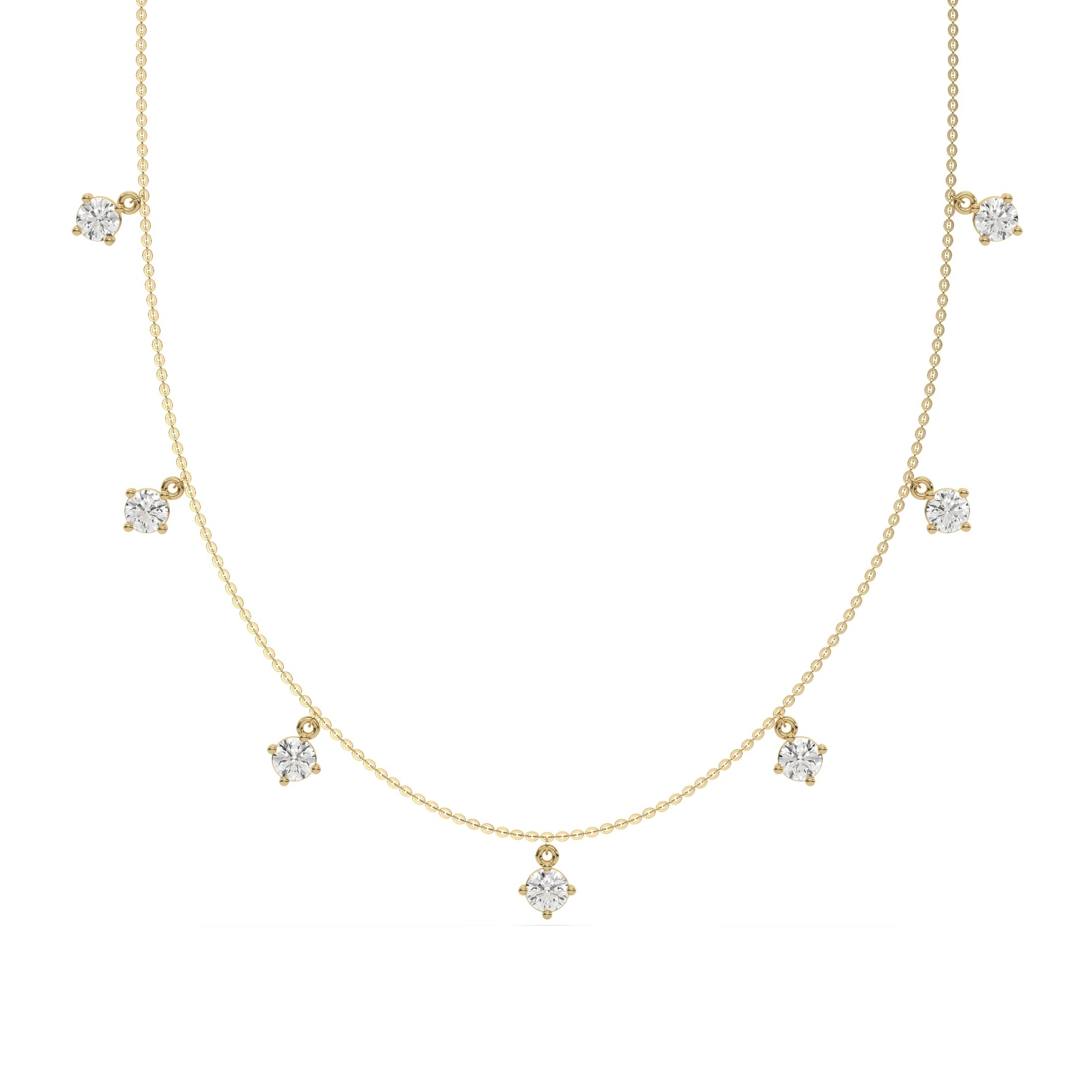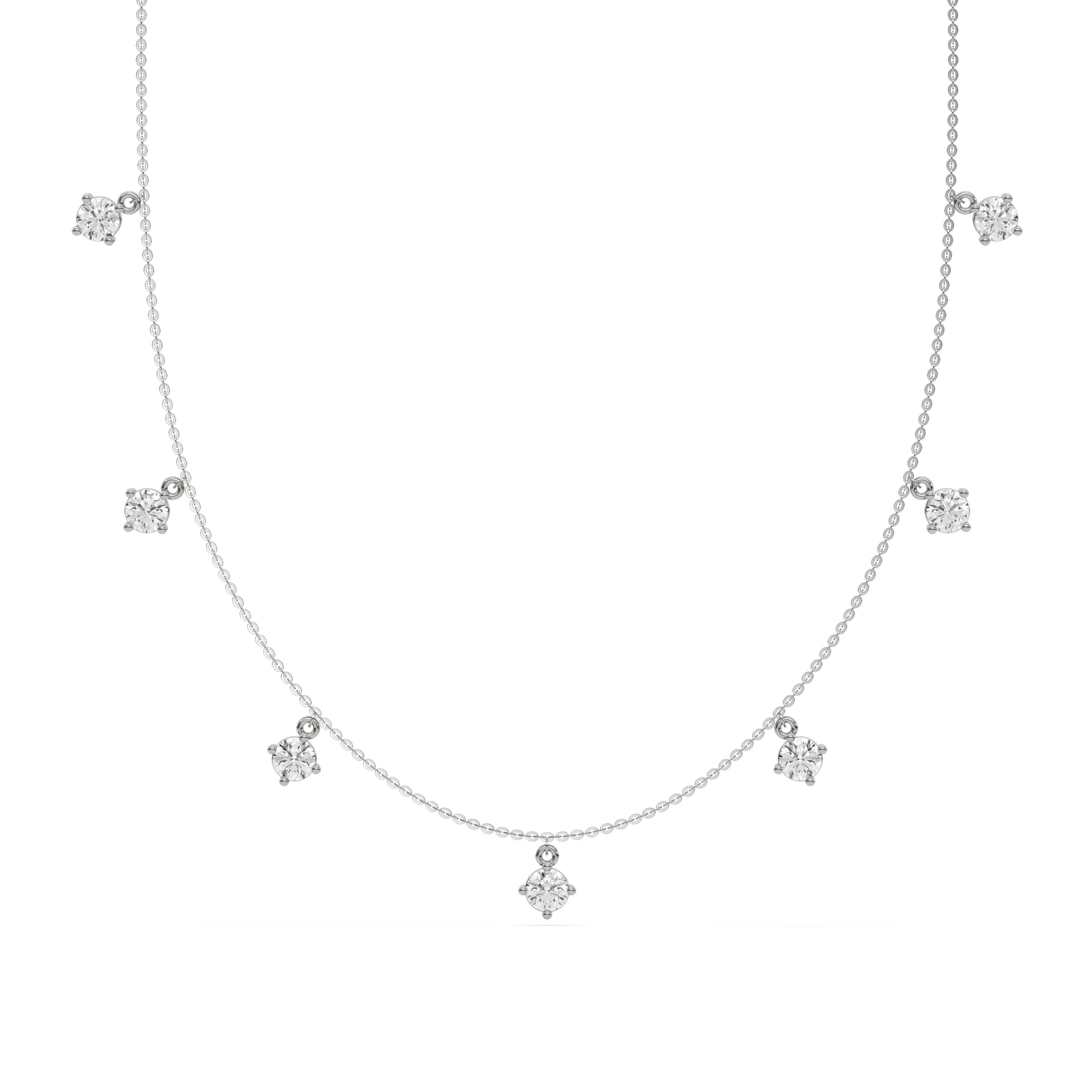 Round Dangling Diamond Necklace made with seven round brilliant-cut diamond set in a prong setting, distributed evenly along the chain.