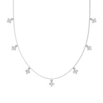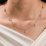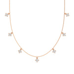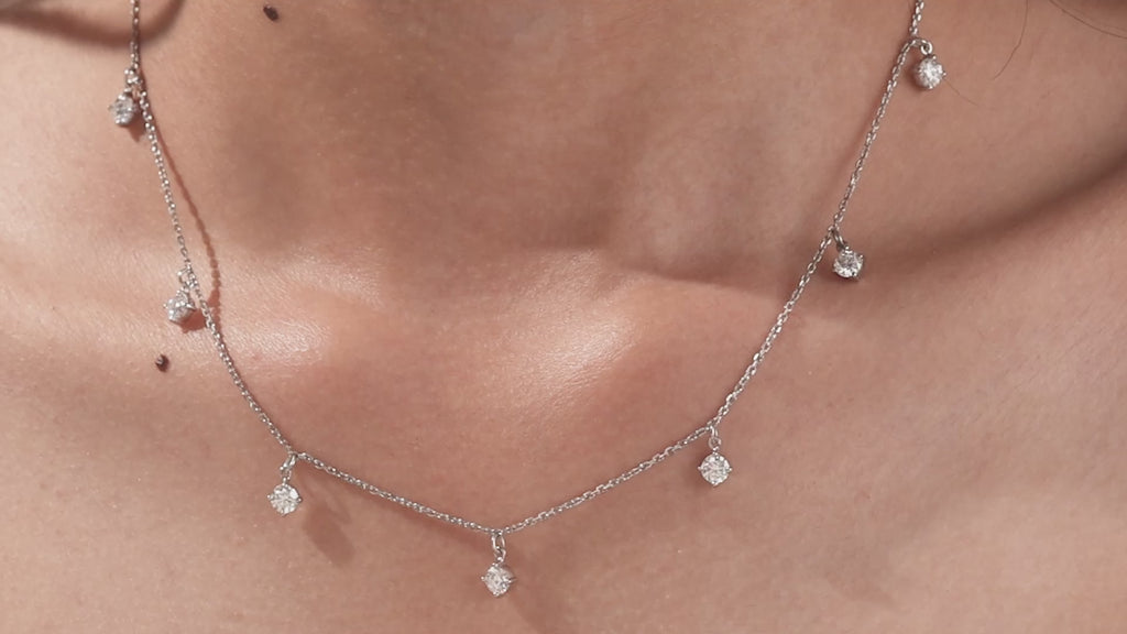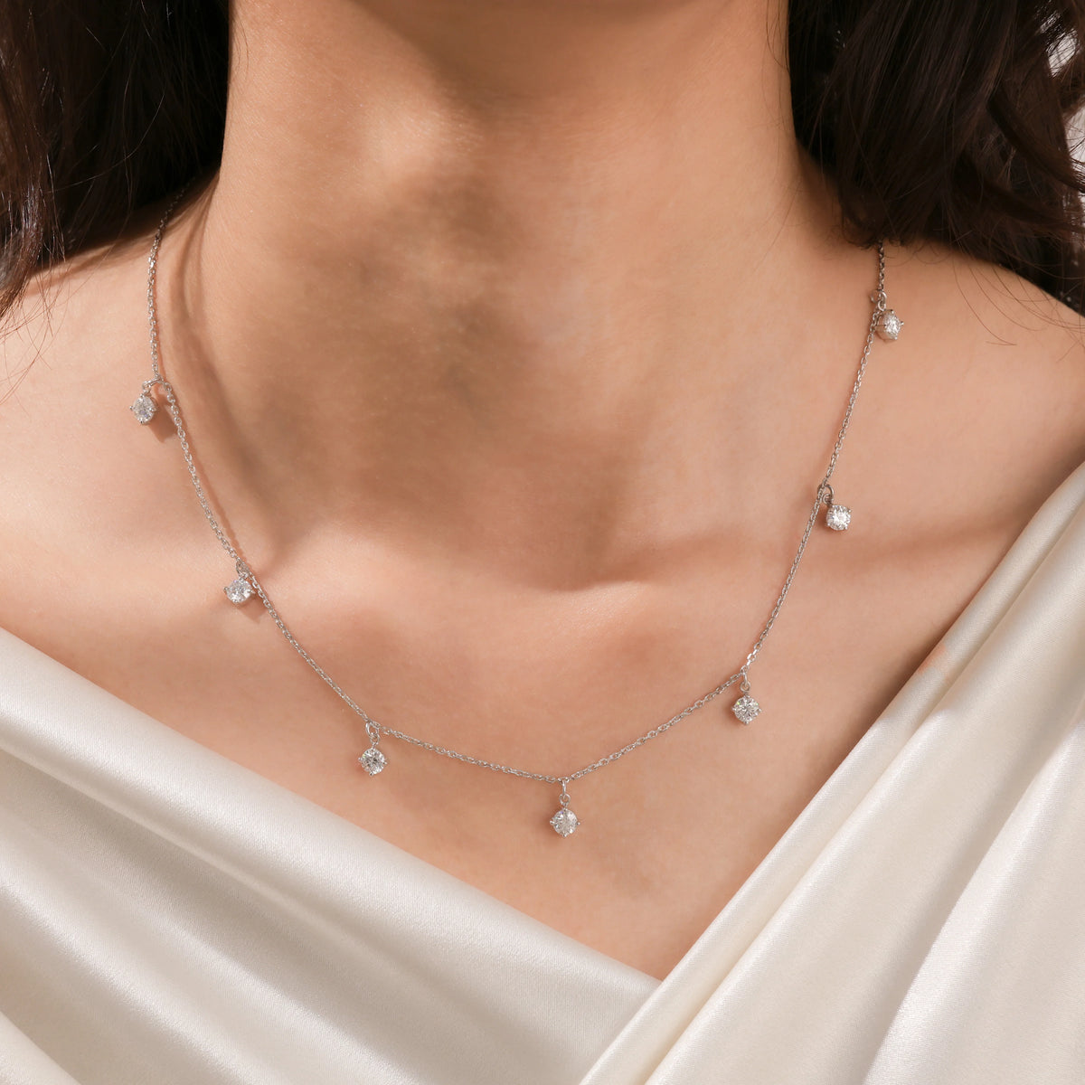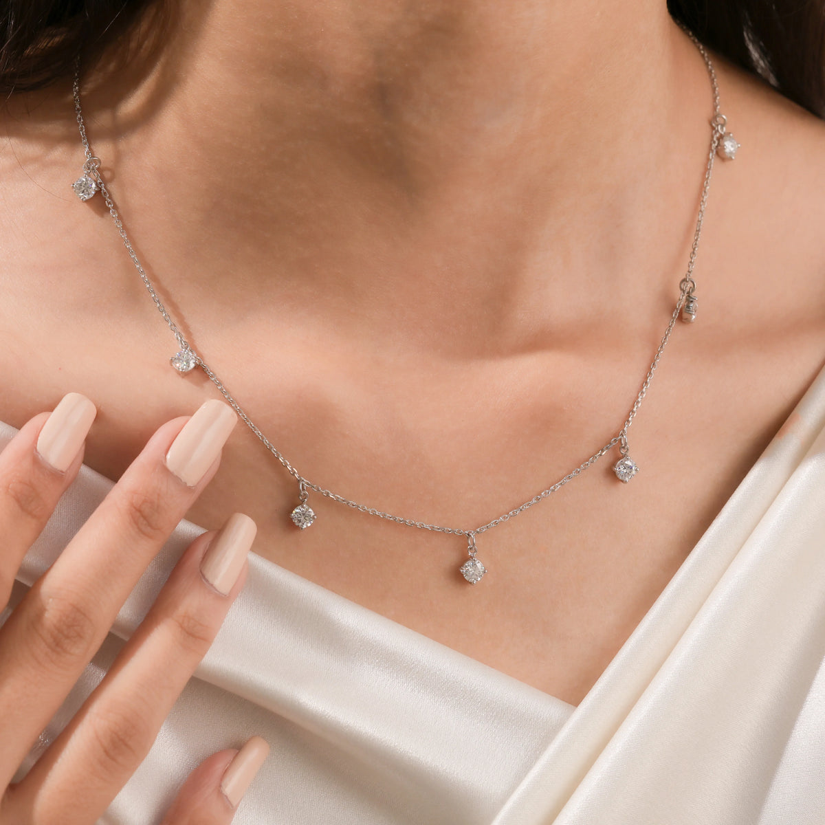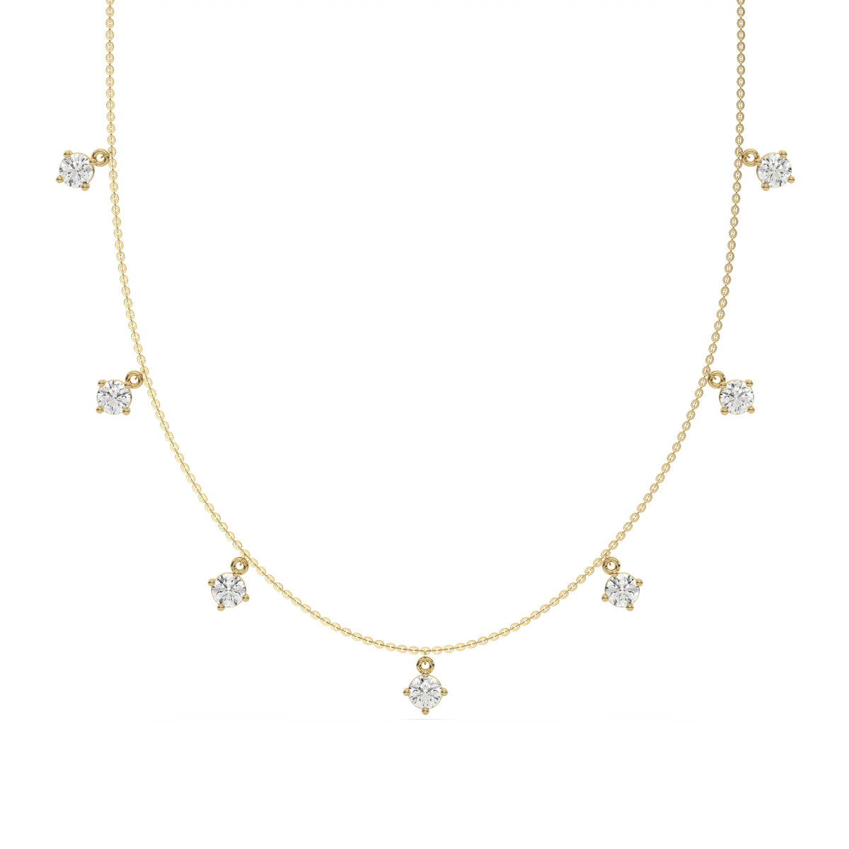 Round Dangling Diamond Necklace made with seven round brilliant-cut diamond set in a prong setting, distributed evenly along the chain.